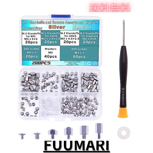 パッケージ内容:便利なボックスに入った200個のシルバーコンピューターネジ。 内容: M.2 スタンドオフ MSI M3 x 6+3用 --- 20個。 M.2 スタンドオフ ASUS M2 x 2.5+2.5用 --- 20個。 M.2 スタンドオフ ASUS M2 x 4.5+2.5用 --- 20個。 M.2 スタンドオフ ギガバイト M2 x 6+4用 --- 20個。 M3x3 SSDネジ--- 20個。 M2x3 SSDネジ--- 60個。 M2ワッシャー---40個。 磁気ドライバー --- 1個。