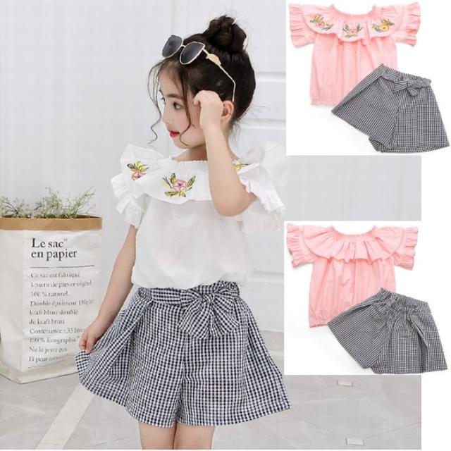 ギャザーやフリルに刺繍をあしらったブラウス&ギンガムチェックのショートパンツ