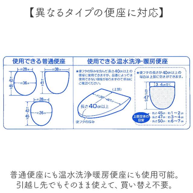 | サイズ | ・適応サイズ 【普通型】 [縦]約41cm〜約45cm/[横(上部)]約28cm〜約38cm [横(中央部)]約36cm 【洗浄・暖房型】 フタの横の長さが約38cm〜約40cm/フタの縦の長さ+フタの手前の厚みが約40cm以上に適応。 ※サイズはメーカー公表サイズです。実際の商品とは多少の誤差が生じる場合がございます。あらかじめご了承ください。 |