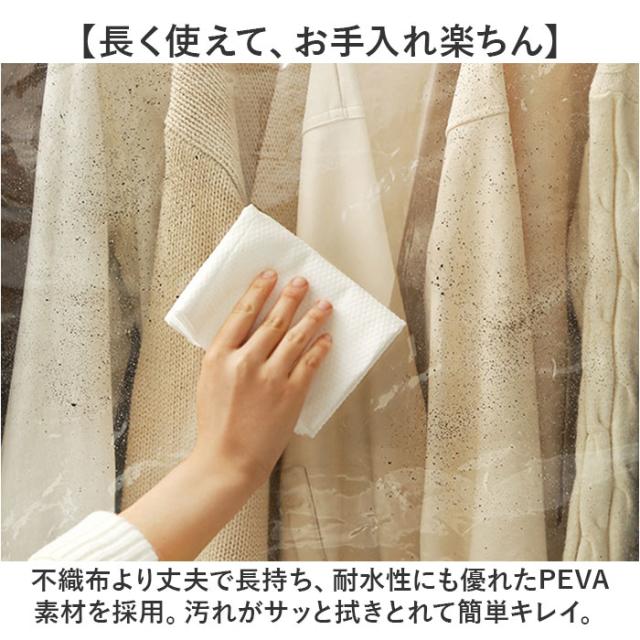 | 商品説明 | 【大切な衣類のホコリ除け、虫除けに】 ・衣類ハンガーにサッと掛けるだけですぐに使える「ハンガーラックカバー(2サイズ)」が新登場。 【お手持ちのハンガーラックに最適】 ・お部屋の片隅にあるパイプハンガーやウッドラックに掛けたお洋服を、すっぽり覆ってフルカバー。 【ホコリや汚れを寄せ付けない】 ・オフシーズンに袖を通さないコートや上着も、ハンガーに掛けたままでホコリや汚れからガード。 【長く使えて、お手入れ楽ちん】 ・不織布より丈夫で長持ち、耐水性にも優れたPEVA素材を採用。汚れがサッと拭きとれて簡単キレイ。 【ファスナーで取り出しスムーズ】 ・カバー中央に上下に開閉するダブルファスナーを配置。お目当てのお洋服がスムーズに取り出せる! ・※横幅60cmタイプ(60×50×150cm)は中央に1列、横幅90cmタイプ(90×50×150cm)は、正面に2列のファスナーを配置しています。 【ワードローブをひと目で確認】 ・ラックに掛けた衣類が透けて見える透明or半透明カラー。お出掛け前のお洋服選びも迷わない♪ 【コートの裾まできちんとカバー】 ・洋服の裾まですっぽり覆う長さ約150cmのゆったりサイズ。コートなど丈の長い服の保管にも最適。 【ひとりでも簡単セッティング】 ・ラック両サイドまで覆う一体型設計。ふわっと被せて両脇のストラップをパイプに結んで取付完了。 【ピッタリサイズが見つかる!】 ・お使いのハンガーラックに合わせて、横幅60cmタイプ、横幅90cmタイプの2種類からチョイス可能。 |