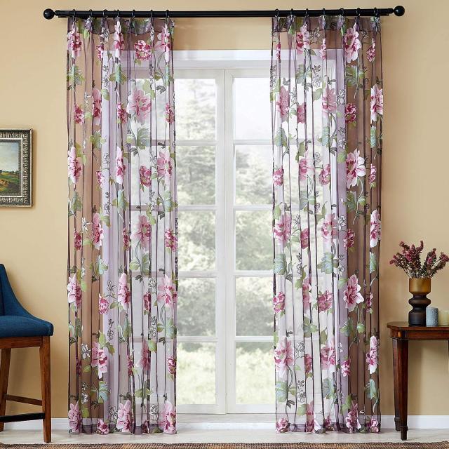 100cmx135cm_パープル Topfinel レースカーテン UVカット 花柄 幅100x丈135cm 2枚組 パープル(全7サイズ3色)