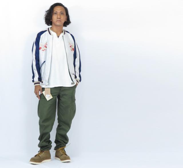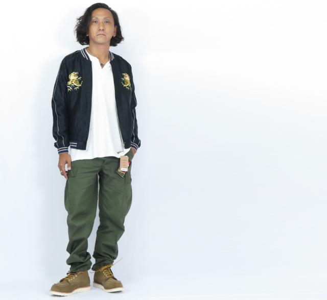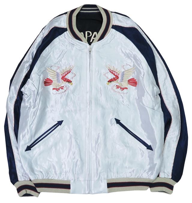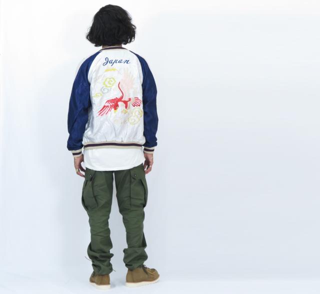 レッドイーグルが映える。通常、スカジャンのボディは濃色の身頃に対して袖に薄い色を組み合わせたものが主流だが、