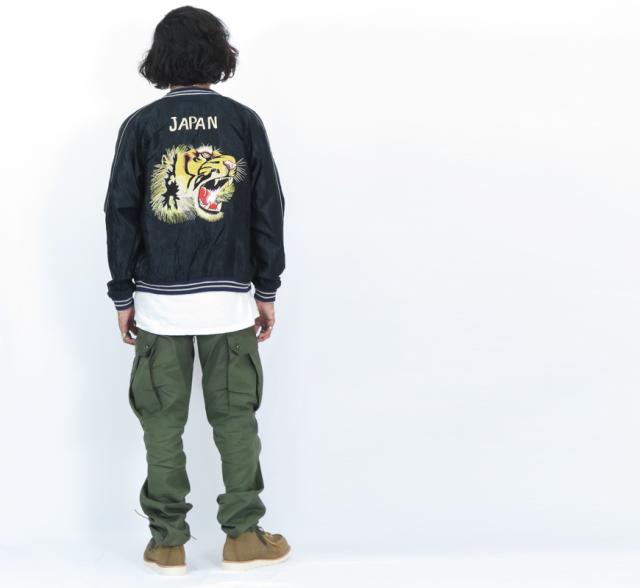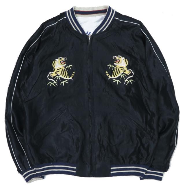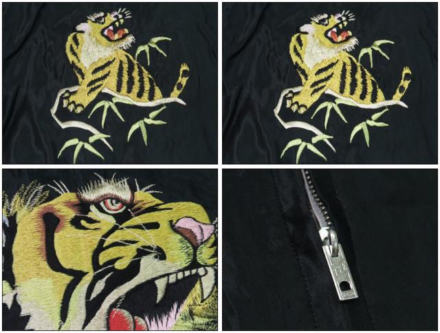 リバーシブル面は対照的に身頃も袖も黒一色のボディ。刺繍は迫力ある虎の顔を細部まで緻密に表現した通称「タイガーヘッド」と呼ばれる