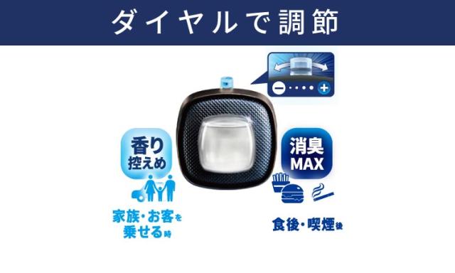 (3) 効果の調節 ダイヤルで香り・消臭の強さを調節。※クリップが完全に上がっていない限り、ダイヤルを動かさない。製品は縦向き・横向き両方の送風口に取り付け可能。