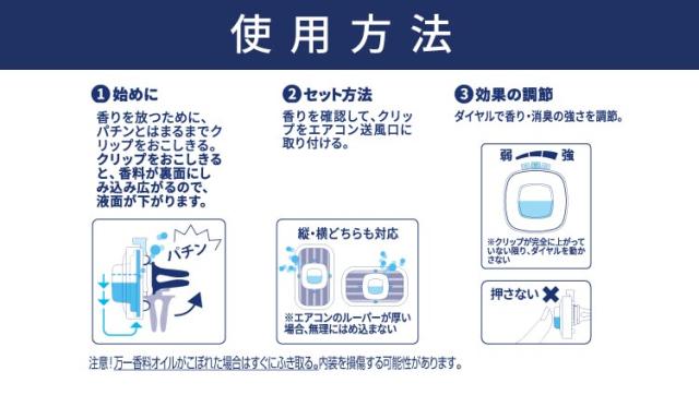(2) セット方法 香りを確認して、クリップをエアコン送風口に取り付ける。※エアコンのルーバーが厚い場合、無理にはめ込まない