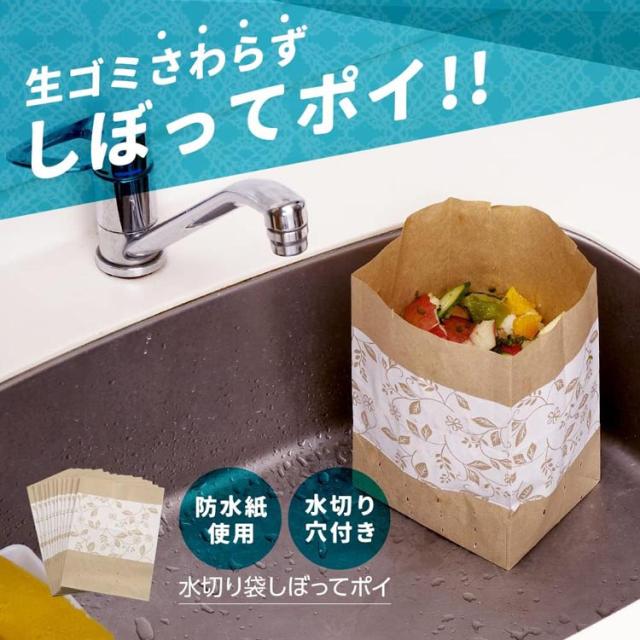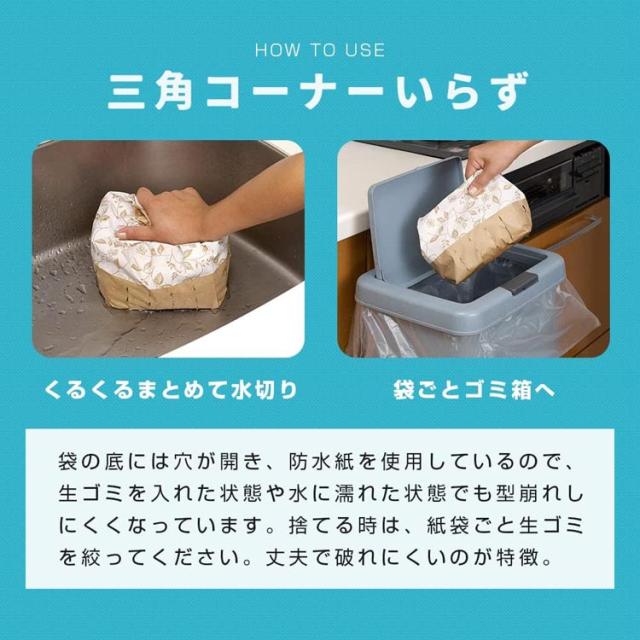 ●袋ごと水切りOK:丈夫で破れにくい防水紙を使用しており、生ごみを入れた状態でも型崩れしにくい!袋の底には水切り穴があるので捨てる時は、紙袋ごと生ゴミを絞ってください。
