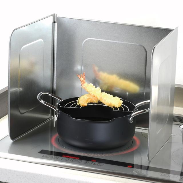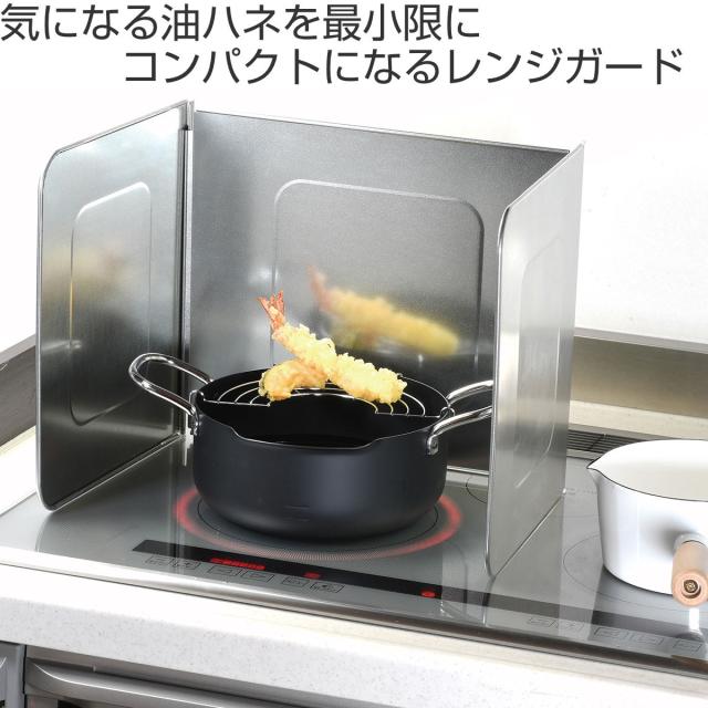 揚げ物や炒め料理での油はねが気になる料理の時に、サッと取り出してコンロを囲って使える便利なレンジガードです。フライパンや鍋のそばに立てるだけの簡単設置で手軽に使えます。