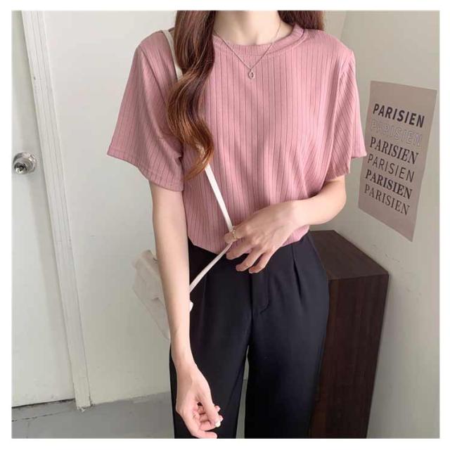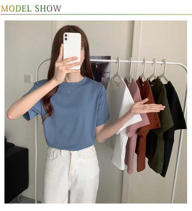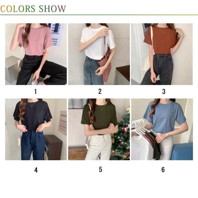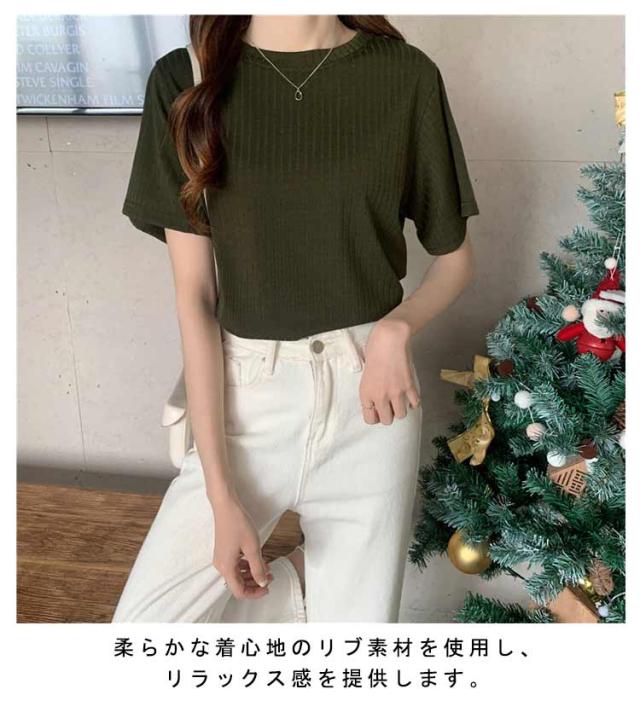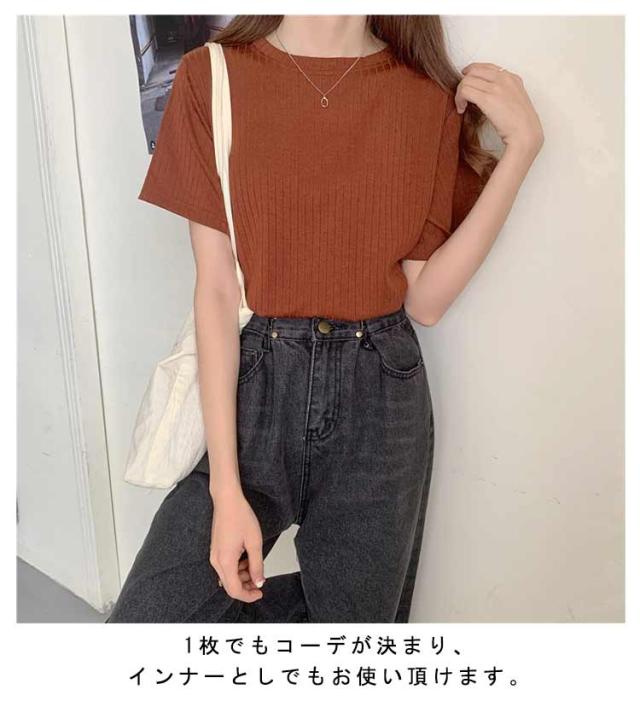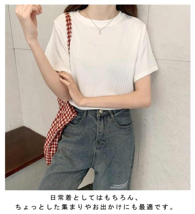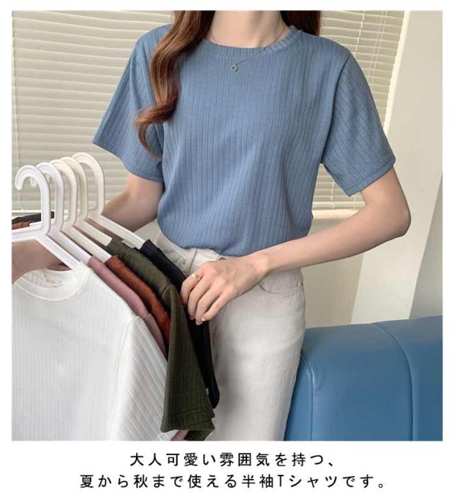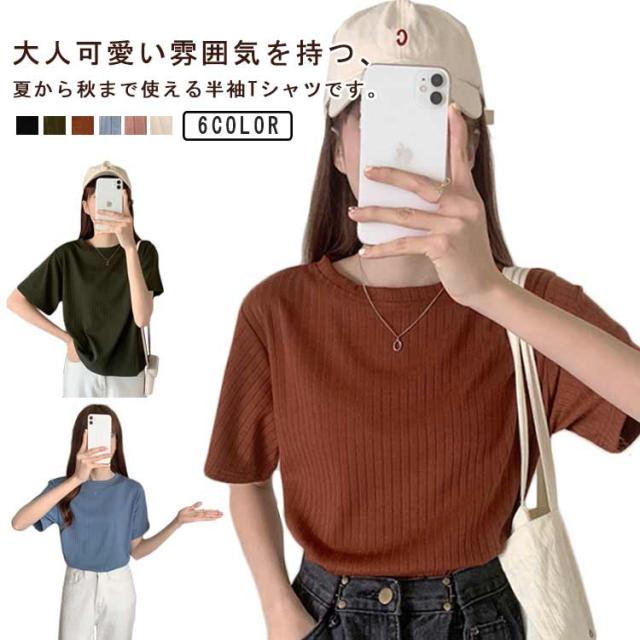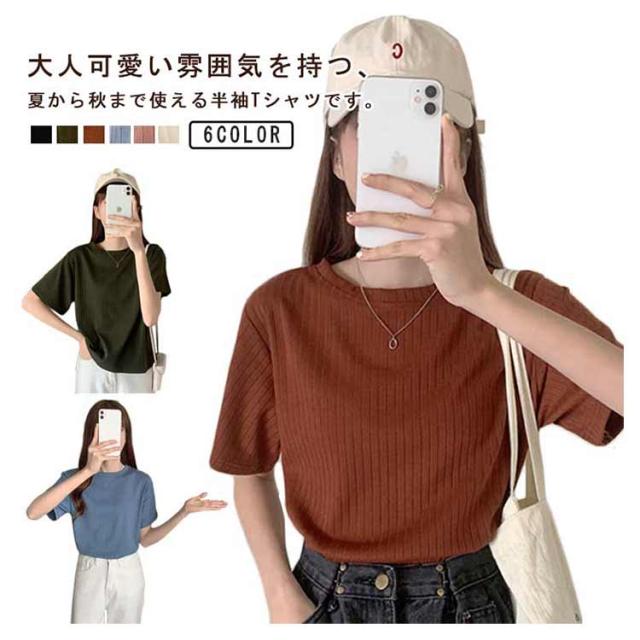 カジュアル 韓国風 リブ 無地 丸首 柔らか Tシャツ 単色 きれいめ トップス クールネック カットソー 半袖 可愛い 半袖 レディース 春夏 薄手 お洒落 ゆったり シンプル 普段着