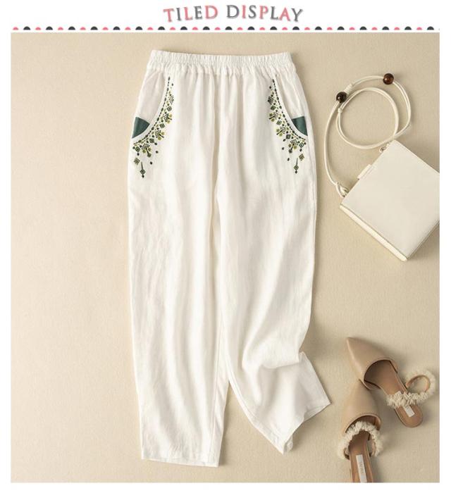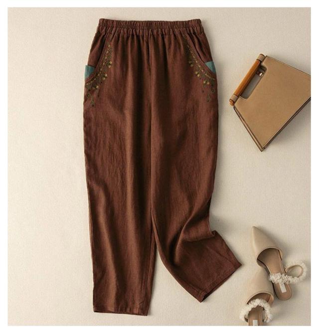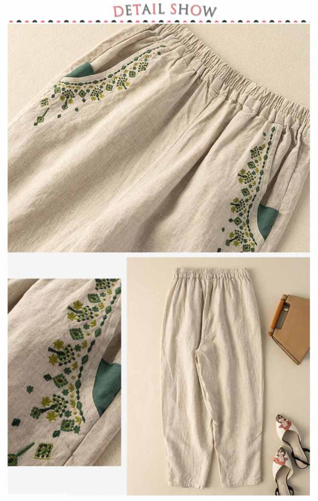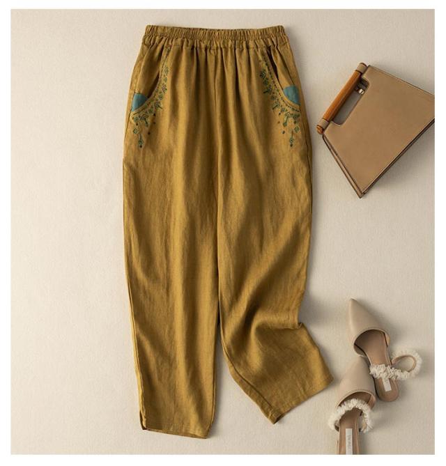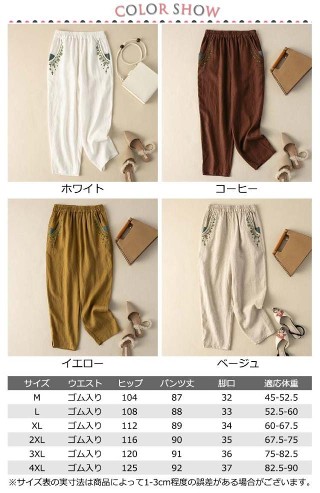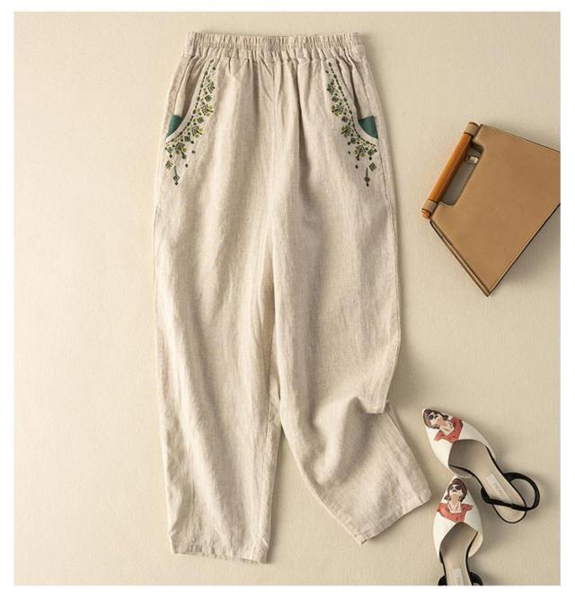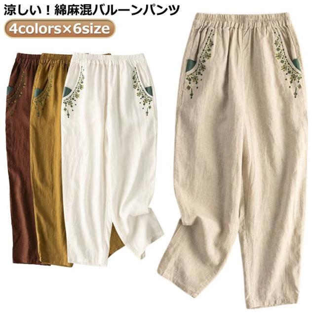 リネンパンツ 麻 パンツ 夏 刺繍 レディース ゆったり パンツ パンツ 棉麻パンツ ウエストゴム 棉 リネン リネン 九分丈 薄手 無地 ポケット パンツ レディース 綿麻 着やせ リラックス 涼しい ウエストゴム サルエル ナチュラル 50代 30代 40代 60代