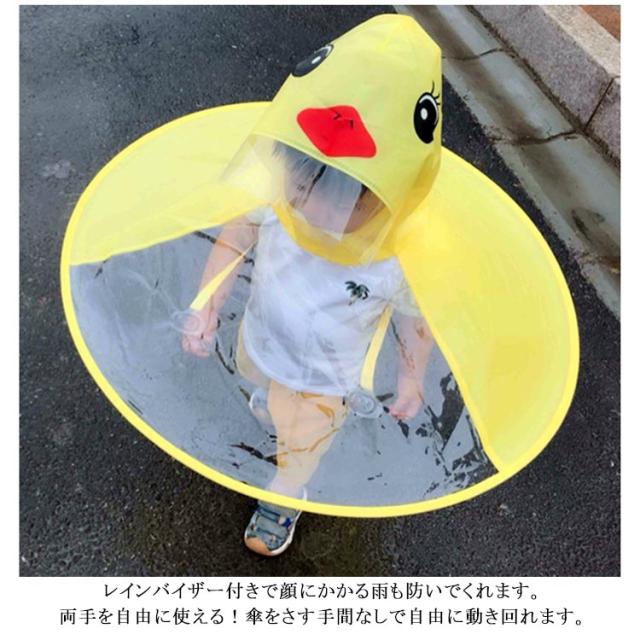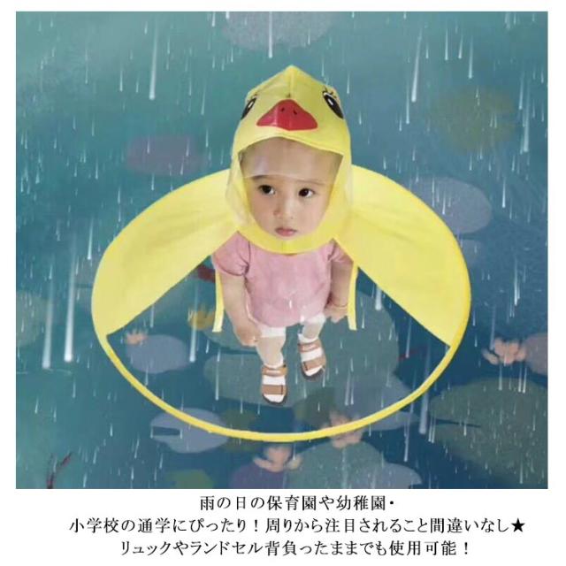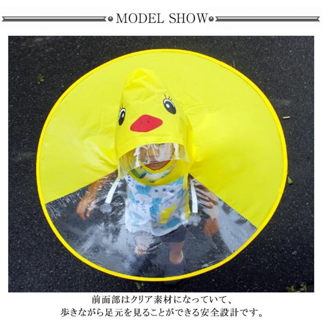 | 前面部はクリア素材になっていて、歩きながら足元を見ることができる安全設計です。 レインバイザー付きで顔にかかる雨も防いでくれます。 両手を自由に使える!傘をさす手間なしで自由に動き回れます。 折り畳み式なのでコンパクトに持ち運びも可能。 雨の日の保育園や幼稚園・小学校の通学にぴったり!周りから注目されること間違いなし★ リュックやランドセル背負ったままでも使用可能! | |