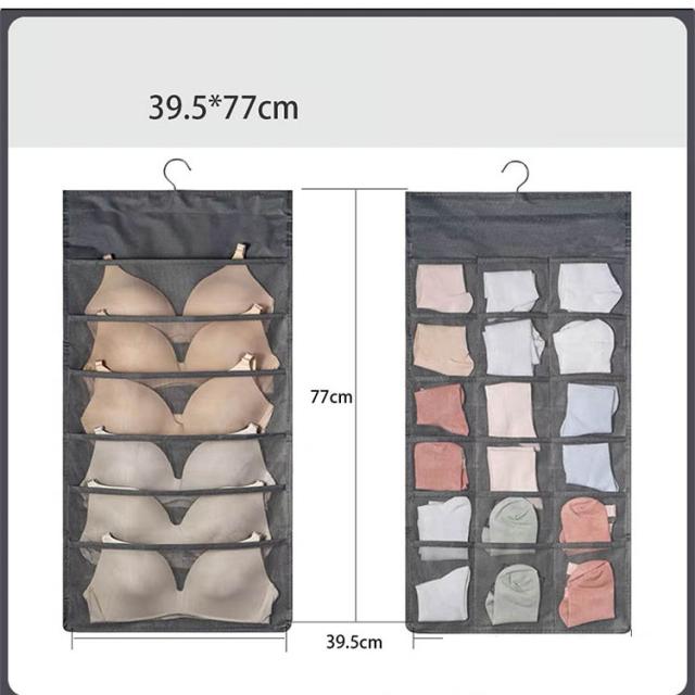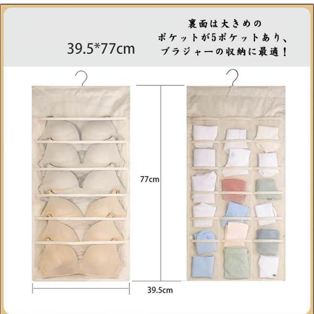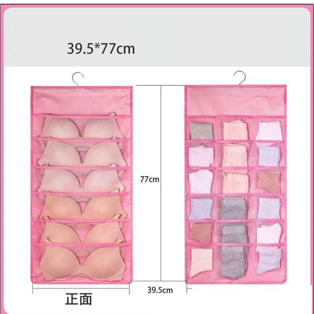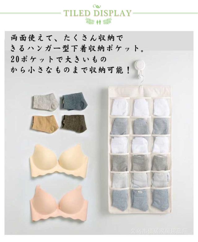 | 2個セット!下着収納ハンガーウォールポケット 両面タイプ 両面使えて、たくさん収納できるハンガー型下着収納ポケット。 20ポケットで大きいものから小さなものまで収納可能! 表は1枚ずつ分けたい衣類や雑貨まで、18ポケットあるから小分けに収納し、下着や靴下に最適! 裏面は大きめのポケットが5ポケットあり、ブラジャーの収納に最適! ポケットは通気性のあるメッシュを採用。湿気も気にならない。 | |