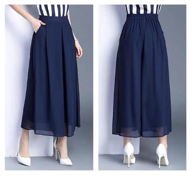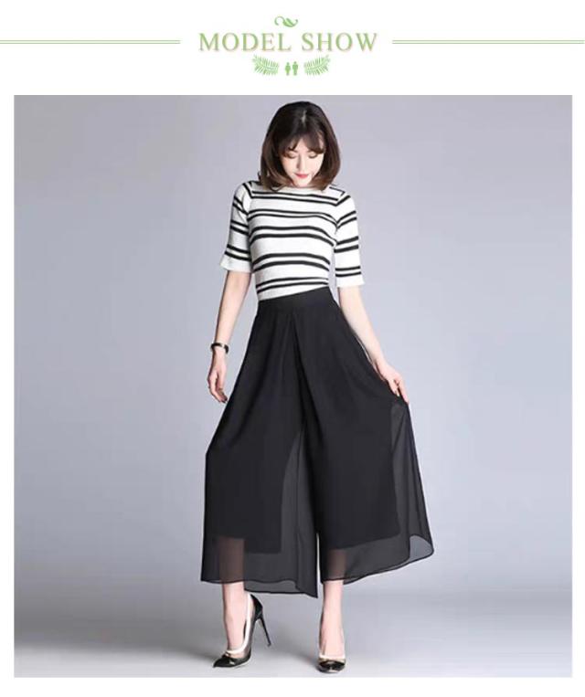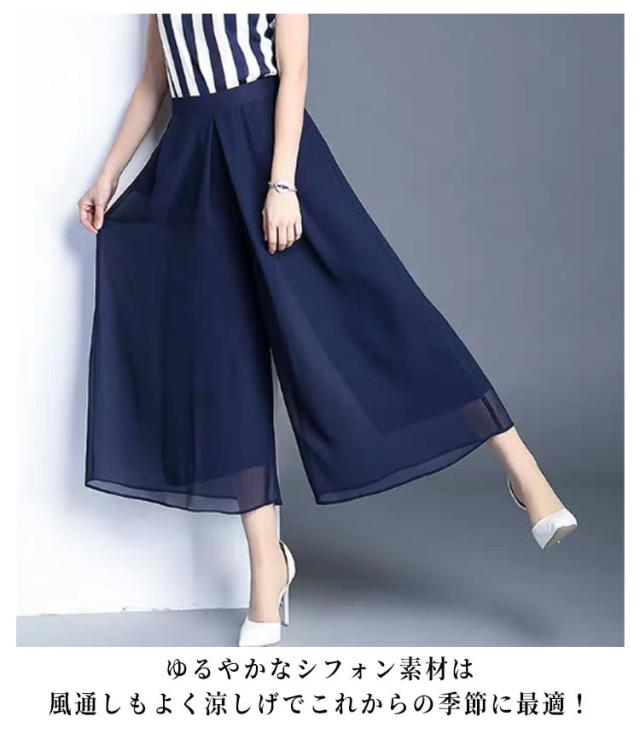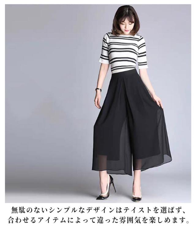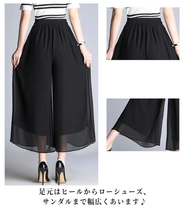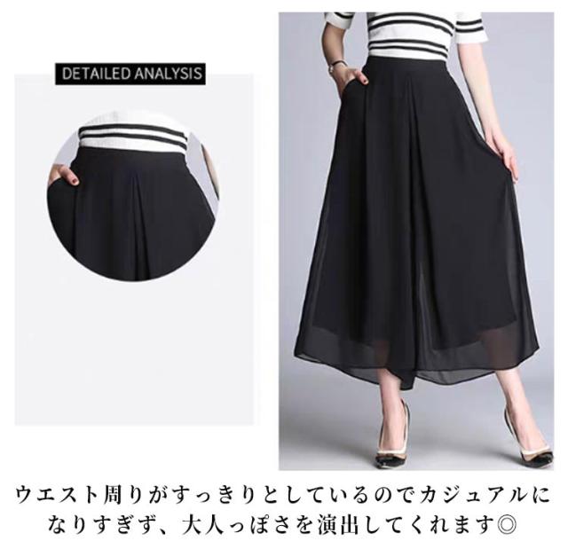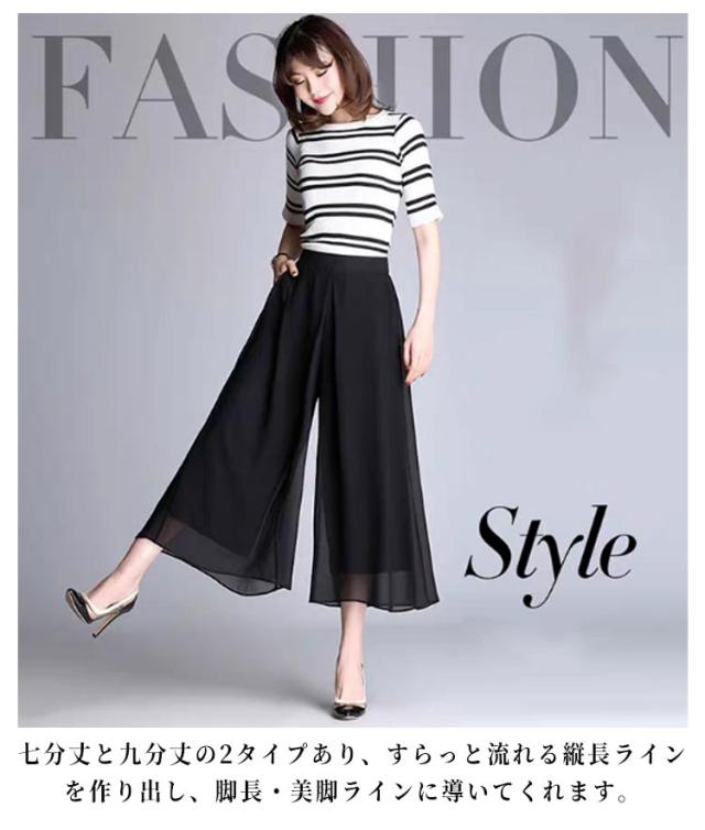 | ふんわり広がるスカートのようなシルエットのワイドパンツ。 七分丈と九分丈の2タイプあり、すらっと流れる縦長ラインを作り出し、脚長・美脚ラインに導いてくれます。 ウエスト周りがすっきりとしているのでカジュアルになりすぎず、大人っぽさを演出してくれます◎ ゆるやかなシフォン素材は風通しもよく涼しげでこれからの季節に最適! 足元はヒールからローシューズ、サンダルまで幅広くあいます♪ 無駄のないシンプルなデザインはテイストを選ばず、合わせるアイテムによって違った雰囲気を楽しめます。 | |