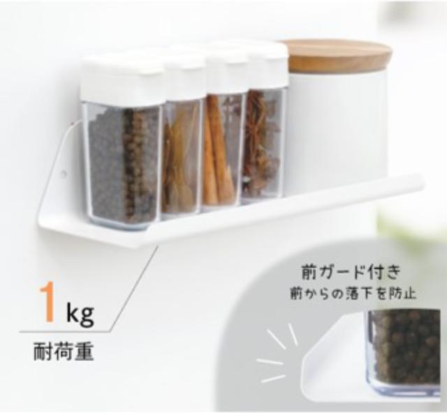 前ガードがついているので置いた物が落ちにくくなっています。耐荷重は1kgあるので、香辛料などの細かい物はもちろん、メガネやハンドクリームなどよく使う物をまとめるのにも便利です。