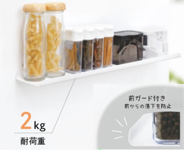 前ガードがついているので置いた物が落ちにくくなっています。耐荷重は2kgあるので、香辛料などの細かい物はもちろん、メガネやハンドクリームなどよく使う物をまとめるのにも便利です。