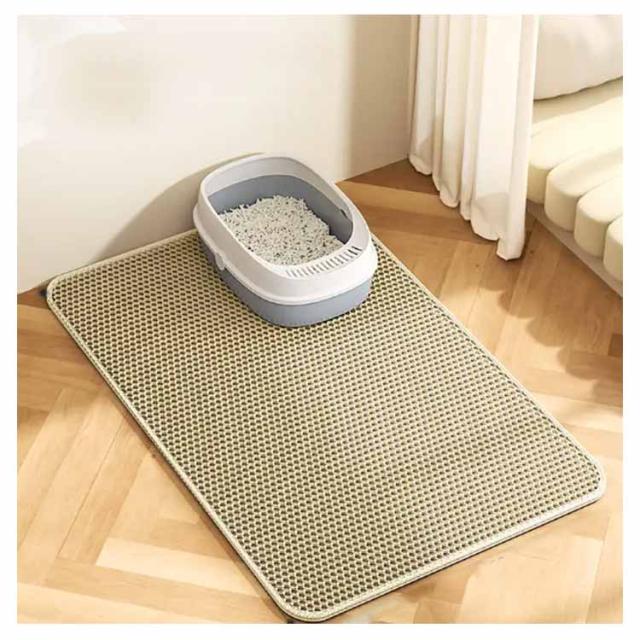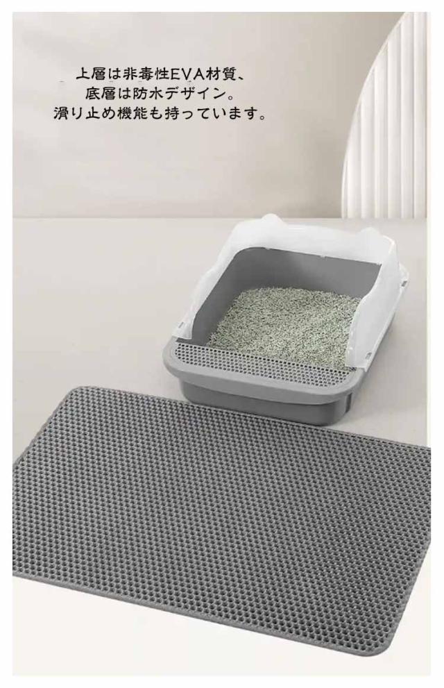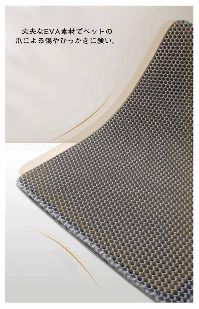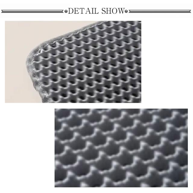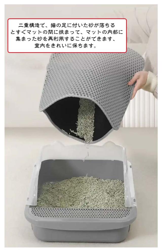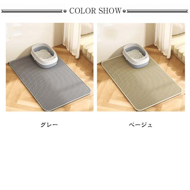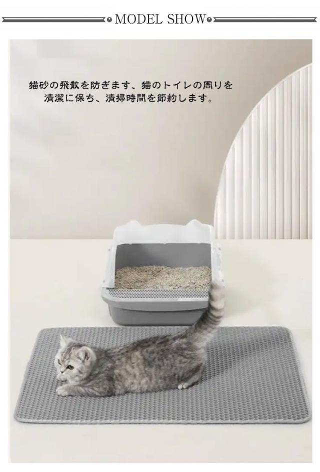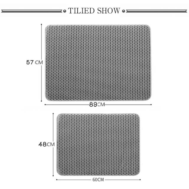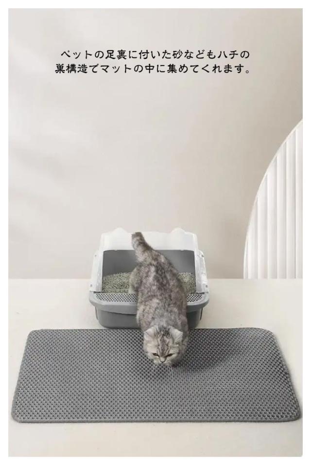 | 【猫砂飛散防止マット】【60*48cm】【89*57cm】 二重構造で、猫の足に付いた砂が落ちるとすぐマットの間に挟まって、マットの内部に集まった砂を再利用することができます、室内をきれいに保ちます。 ペットの足裏に付いた砂などもハチの巣構造でマットの中に集めてくれます。 猫砂の飛散を防ぎます、猫のトイレの周りを清潔に保ち、清掃時間を節約します。 折り畳みできるので収納する場合スペースを節約できます。 丈夫なEVA素材でペットの爪による傷やひっかきに強い。 上層は非毒性EVA材質、底層は防水デザイン。滑り止め機能も持っています。 | |