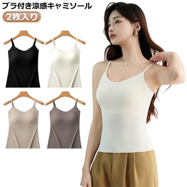 2枚入り ブラ付き キャミソール 涼感 キャミソール ナイロン 接触冷感 ひんやり 涼しい ゆったり キャミソール Vネック ストラップネック 大きいサイズ 夏 ひんやりタンクトップ インナー キャミ 肌着 レディース ノースリーブ トップス 下着 キャミソール タンクトップ