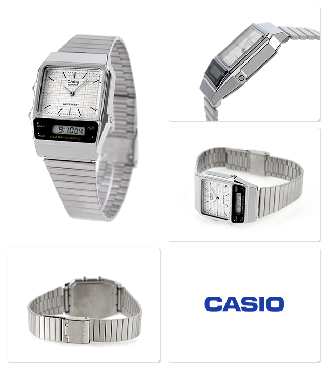 カシオ クラシック チプカシ クオーツ ユニセックス 腕時計 AQ-800E-7ADF CASIO CLASSIC アナデジ ホワイト ◆1980年代発売のAQ-450をモチーフにし、レトロとスタイリッシュが融合したモデルです。文字板と液晶が独立したデザインで、アナログの美しさとデジタルの機能性を両立。アナログ文字板はシンプルなバーインデックスと時分針で構成。盤面に格子柄をあしらい、レトロな雰囲気に仕上げました。ケース液晶部はトップ面を傾斜させたスタイリッシュな形状に仕上げています。また角型フォルムのケースと横長の駒形状を採用したメタルバンドを組み合わせることで、面構成が際立つスタイリッシュな外観に。ストップウオッチ、アラーム、デュアルタイム等、日常生活に便利な機能も備えています。オンオフ問わずコーディネートに合わせやすい時計です。 国内モデル品番:AQ-800E-7AJF