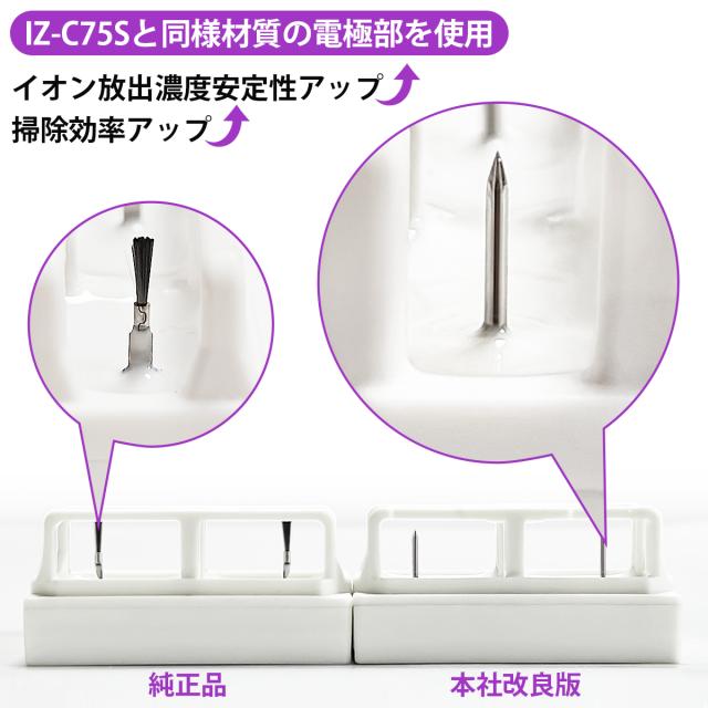■ 対応型番:IZ-C90M(本製品はシャープの「加湿空気清浄機、イオン発生機、空気清浄機(天井設置型)、衣類乾燥除湿機、加湿器」にご使用いただける互換品です。同性能ですので共通してお使い頂けます。) ■改良版プラスマジェネレイションはIZ-C75Sと同様材質の電極部を使用しているため、接触部位が集中して、イオン放出濃度がより安定し、消耗を節約する。ホコリが付着する面積が減少したため、純正品のブラシより掃除が簡単、メンテナンス間隔が長くなります。 ■ 交換の目安説明: 1日24時間連続して運転した場合、約2年(使用時間や設置場所により交換時期は異なります。) ■ 使用環境や使用場所(食用油など油成分が浮遊している場所、ホコリや湿気の多い場所、スプレーや化学薬品を使う場所など)により交換時期が早くなる場合があります。 ■ 安定して高濃度プラズマイオンを放出するために、定期的にイオン発生ユニットの交換が必要です。(交換時期になると本体正面のランプが点滅しお知らせしますので、その際には速やかに交換をお勧めいたします。) 高濃度プラズマイオン発生ユニットIZ-C90M対応機種: 【加湿空気清浄機 KIシリーズ】 KI-SS54-W , KI-SS53-W , KI-SS52-W , KI-SS51-W , KI-SS50-W , KI-SS50-H , KI-S70Y9-W KI-S70Y9-H , KI-S70E4-W , KI-S70E4-H , KI-S50E9-W , KI-S50E9-H , KI-S50E8-W , KI-S50E8-H KI-S50E7-W , KI-S50E7-H , KI-S50E6-W , KI-S50E6-H , KI-S50E5-W , KI-S50E5-H , KI-S50E3-W KI-S50E3-H , KI-S50E2-W , KI-S50E2-H , KI-RS50-W , KI-RS50-H , KI-RS40-W , KI-RD50-W KI-PS50-W , KI-PS50-H , KI-PS40-W , KI-PD50-W , KI-NX75-W , KI-NX75-T , KI-NS70-W KI-NS70-T , KI-NS50-W , KI-NS50-H , KI-NS40-W , KI-ND50-W , KI-N75YX-W , KI-N75YX-T KI-LX75-W , KI-LX75-T , KI-LS70-W , KI-LS70-T , KI-LS50-W , KI-LS50-H , KI-LS40-W KI-LD50-W , KI-L75YX-W , KI-L75YX-T , KI-JS70-W , KI-JS70-H , KI-JS50-W , KI-JS50-H KI-JS40-W , KI-HS70-W , KI-HS70-H , KI-HS50-W , KI-HS50-H , KI-HS40-W , KI-GS70-W KI-GS70-HKI-GS50-W , KI-GS50-H 【イオン発生機 IGシリーズ 】 IG-LTA20-W , IG-LC15-W , IG-LC15-R , IG-LC15-B , IG-KTA20-W , IG-KC15-W , IG-KC15-R IG-KC15-B , IG-JC15-W , IG-JC15-R , IG-JC15-B , IG-HTA30-W , IG-HTA20-W , IG-HC15-W IG-HC15-R , IG-HC15-B 【空気清浄機(天井設置型) FPシリーズ】 FP-S120-T , FP-FX2-W , FP-AT3-W 【衣類乾燥除湿機 CVシリーズ】 CV-RH140-W , CV-PH140-W , CV-NH140-W 【加湿器 HVシリーズ】 HV-R120-W ※ご購入の前にご希望商品の対応機種一覧より、適合商品である事をご確認願います。 ※購入検討商品に関してご不明な点やご不安をお持ちのお客様は、ご購入前にお問い合わせください。 |