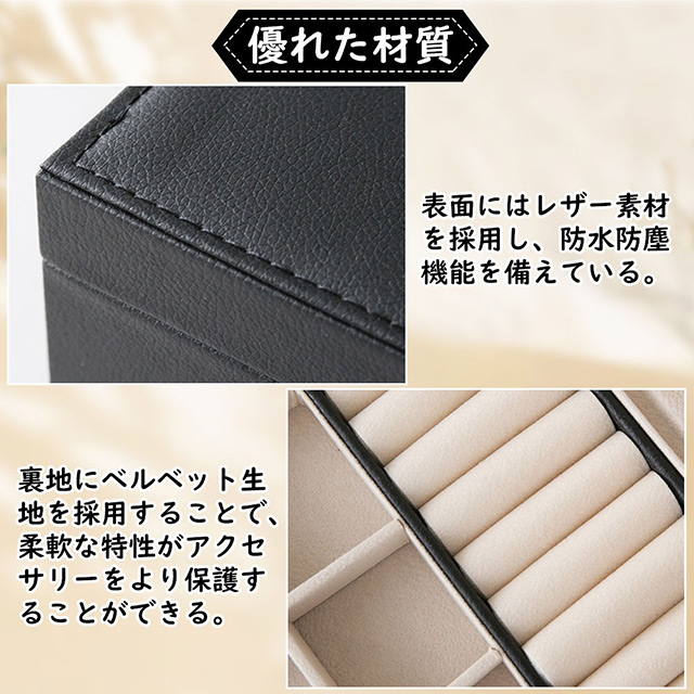 【貴重なジュエリーを守る高品質のレザー】表面は汚れに耐えるPUレザーを採用し、撥水加工も施されているので、ぬれタオルで拭くだけで、宝石箱をきれいに保つことができます。裏地は非常に柔らかいベルベット生地で作られていて、手触りが良く、貴重なジュエリーを傷から守ります。