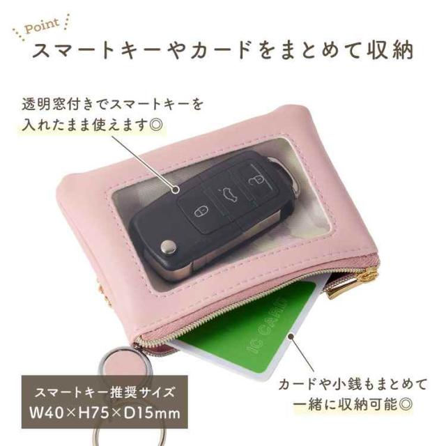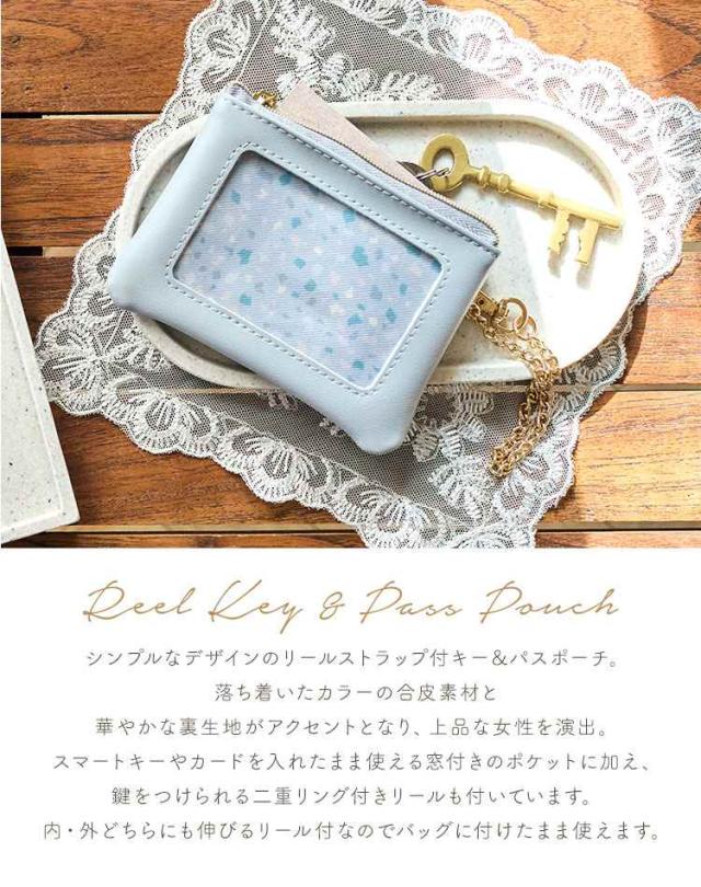 伸びるリール付きキー&パスポーチ。キーケースとパスケースが一体になっているのでとっても便利♪窓付きポケットはカードやスマートキーを入れたまま使えます◎落ち着いたカラーの合皮素材と華やかな裏生地がアクセントの上品なデザインで、通勤・通学にぴったりです。