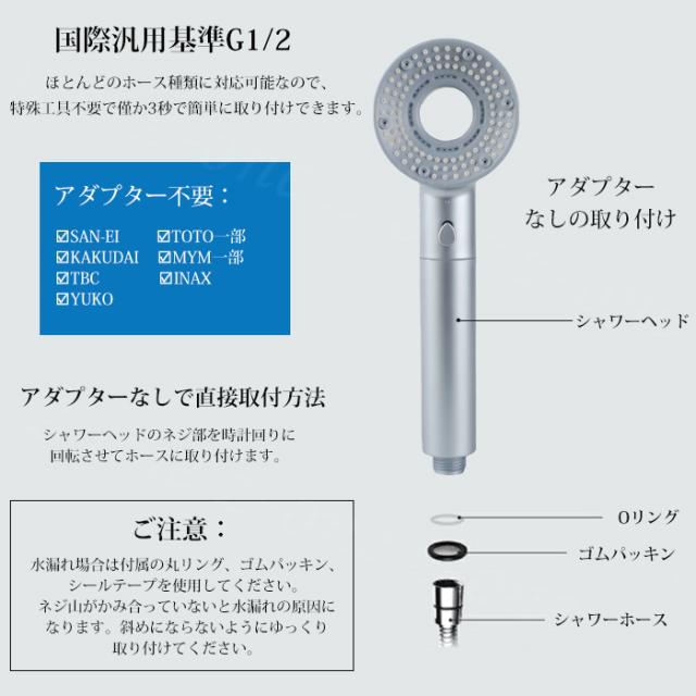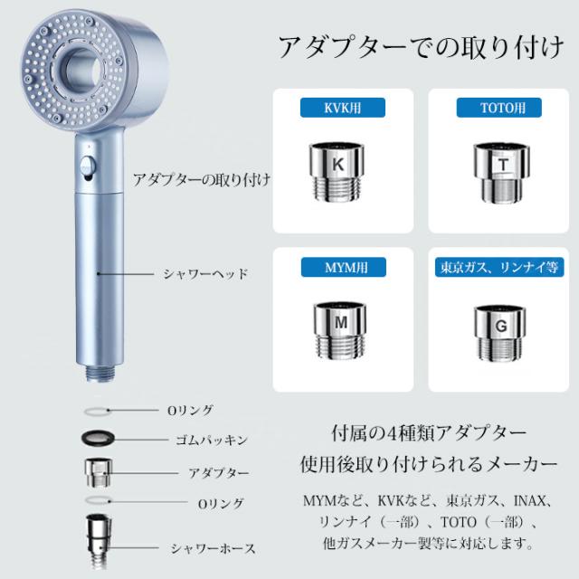 ◆4類のアダプターが付いております。ほとんどのシャワーヘッドに交換可能ですが、アダプター利用して取り付けできない場合は、まずアダプターなしでお試しください。