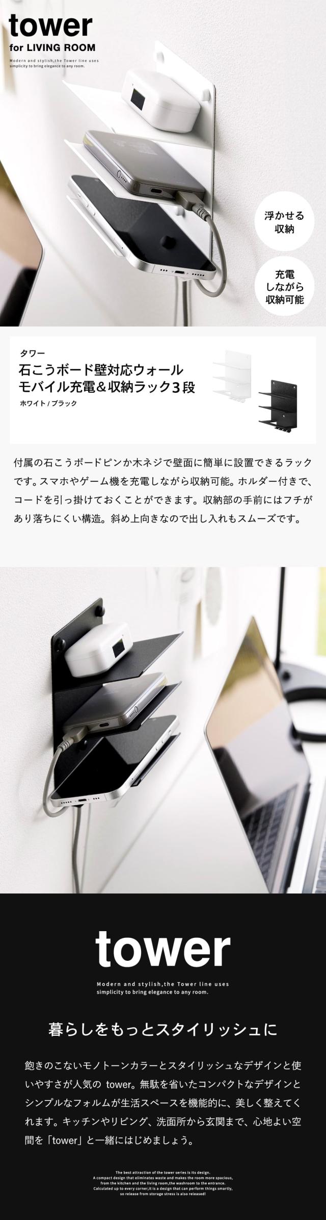 山崎実業 公式 tower ウォールモバイル充電&収納ラック タワー 3段 石こうボード壁対応 1877 1878 ホワイト ブラック スマホ 置き ラック 壁面収納 ワイヤレスイヤホン スマートウォッチ スマホスタンド