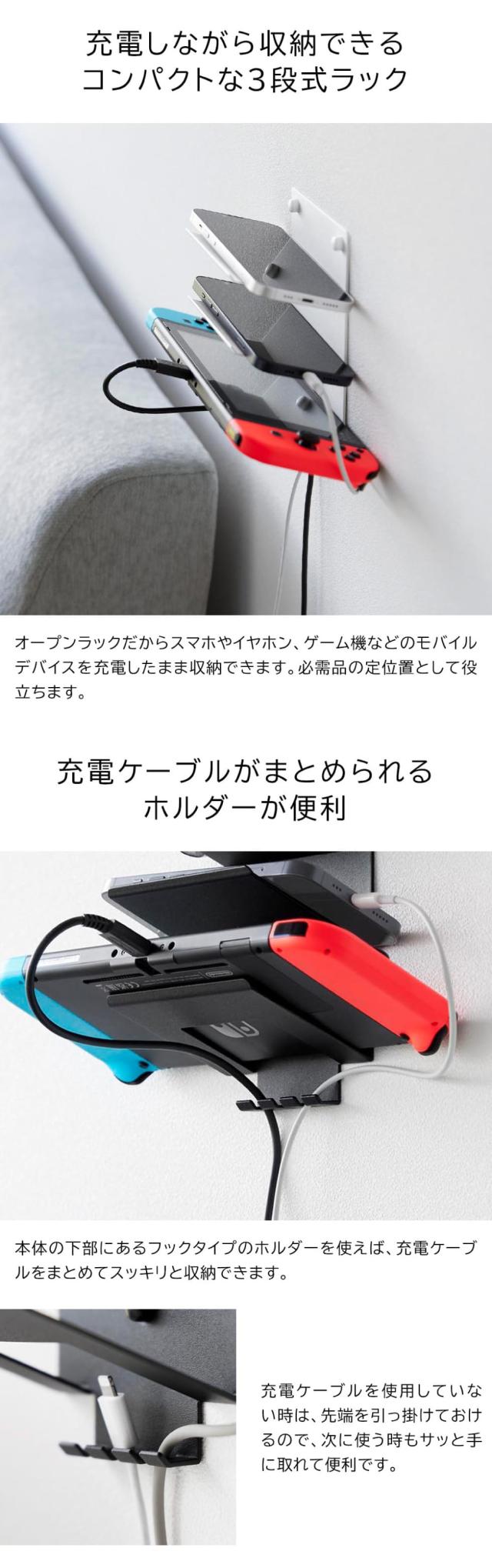 スマートフォンやイヤホン、ゲーム機などのモバイルデバイスを充電しながら収納できる3段ラック デスク周りやベッドサイドの限られたスペースにすっきり収納 yamazaki タワーシリーズ