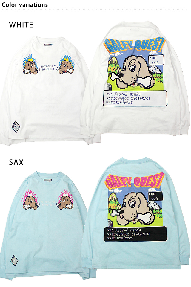 ストリートエッセンスを柔軟に捉え、都会的かつアクティブな提案を展開していく「GALFY」さんから「ガルクエロンTee(143006)」のご紹介です。 90年代にアウトローから絶大な人気を博し、一大ブームを巻き起こした犬のキャラクターが特徴の 「GALFY」 が5年間の沈黙を破り、Revival&Rebrandを経て現在に復活しました! 『なかまにしてくれますか?』by GALFY 国民的RPGをGALFYのフィルターを通して落とし込んだ存在感抜群の長袖Tシャツです。 バックに大きくデザインされたレトロなゲーム風ピクセル画をプリントと刺繍で表現したインパクトある仕上がり。 メッセージも遊び心ある仕上がりで細部にまでこだわった一枚です。 サイドスリットの入ったゆったりとしたサイジングでストリートスタイルに大活躍間違いなし。 女性にもおすすめのユニセックスアイテムになります。 | ||||||||||||