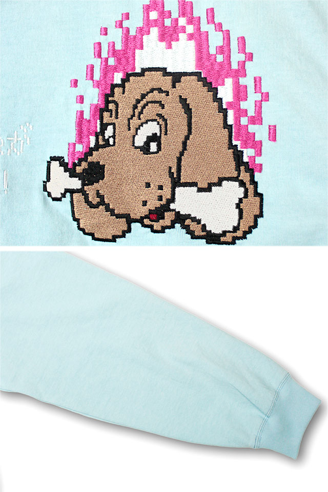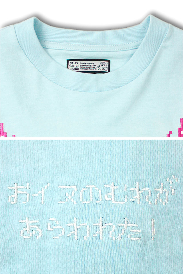 バックに大きくデザインされたレトロなゲーム風ピクセル画をプリントと刺繍で表現したインパクトある仕上がり。