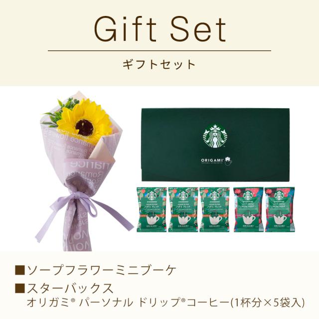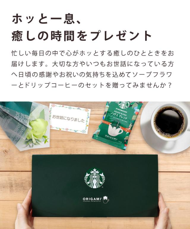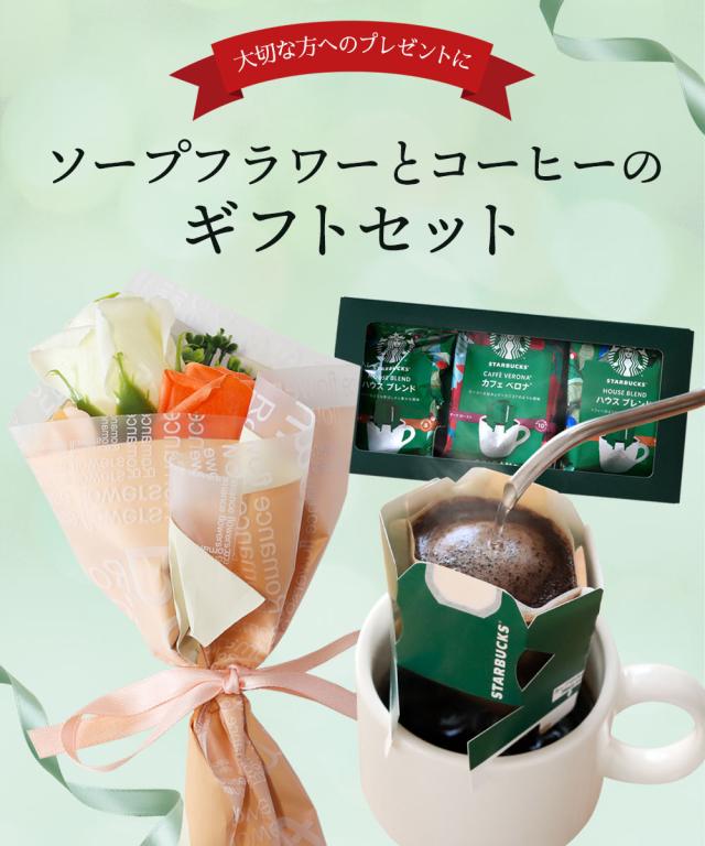 香りと彩りに癒されるソープフラワーと、人気カフェ「スターバックスコーヒー」のドリップコーヒーのギフトセットです。