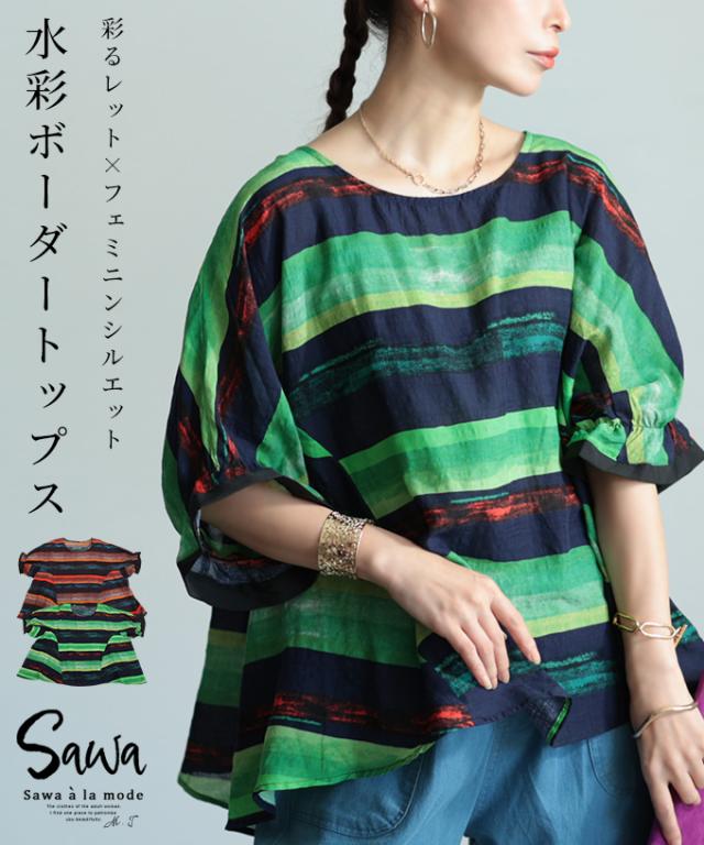 春新作 こなれるヒトクセ水彩ボーダーフレアトップス レディース ファッション トップス ボーダー 水彩 配色 プルオーバー フレア 変形 コットン カットソー 30代 40代 50代 60代 サワアラモード sawaalamode otona 大人 cawaii 可愛い 洋服 かわいい服 sawa-9707