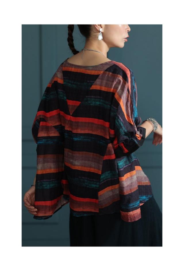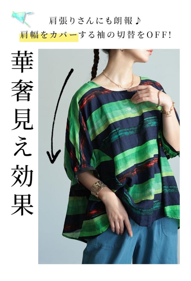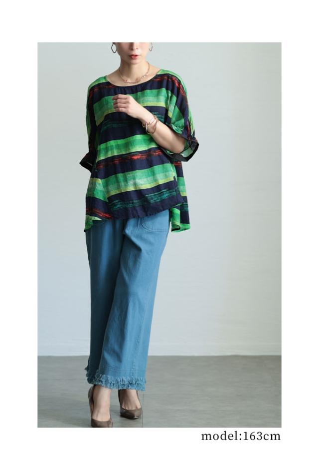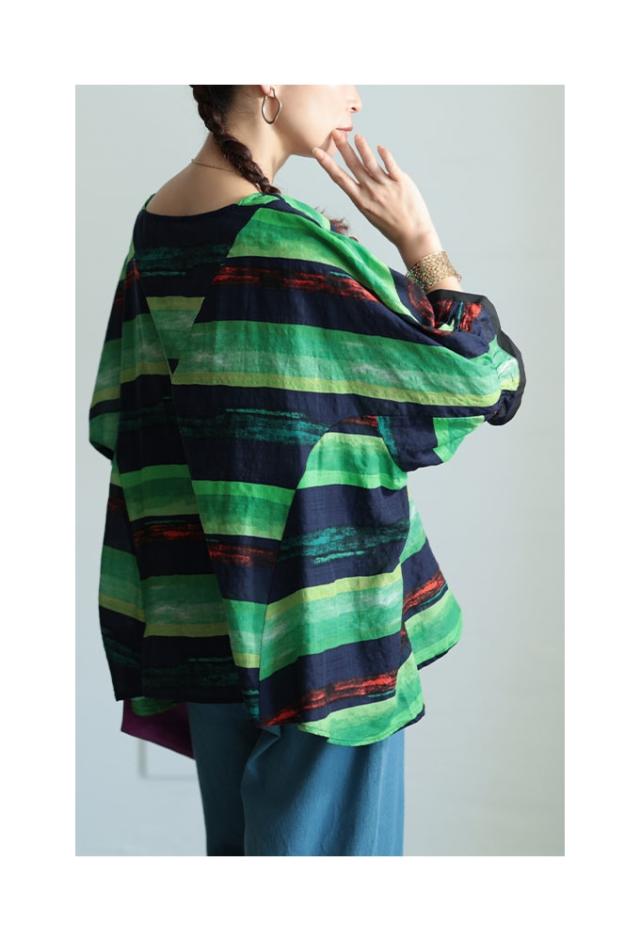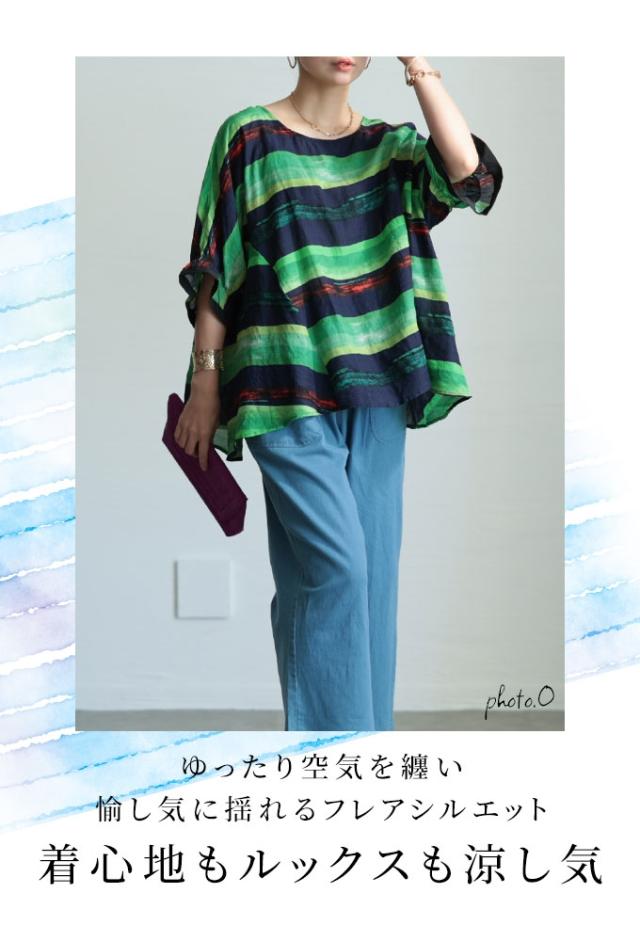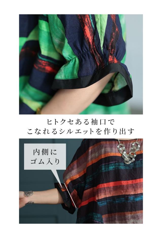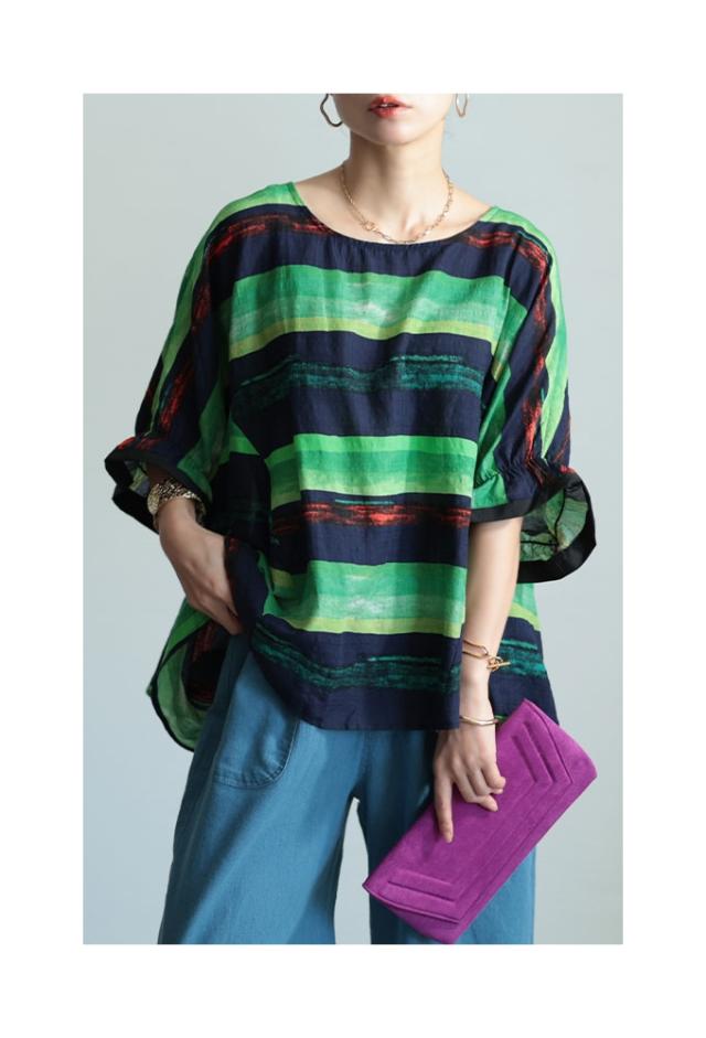 特徴: ボーダー 水彩風 手書き風 フレア 変形 キャンディースリーブ 配色 バイカラー コットン 綿 タック