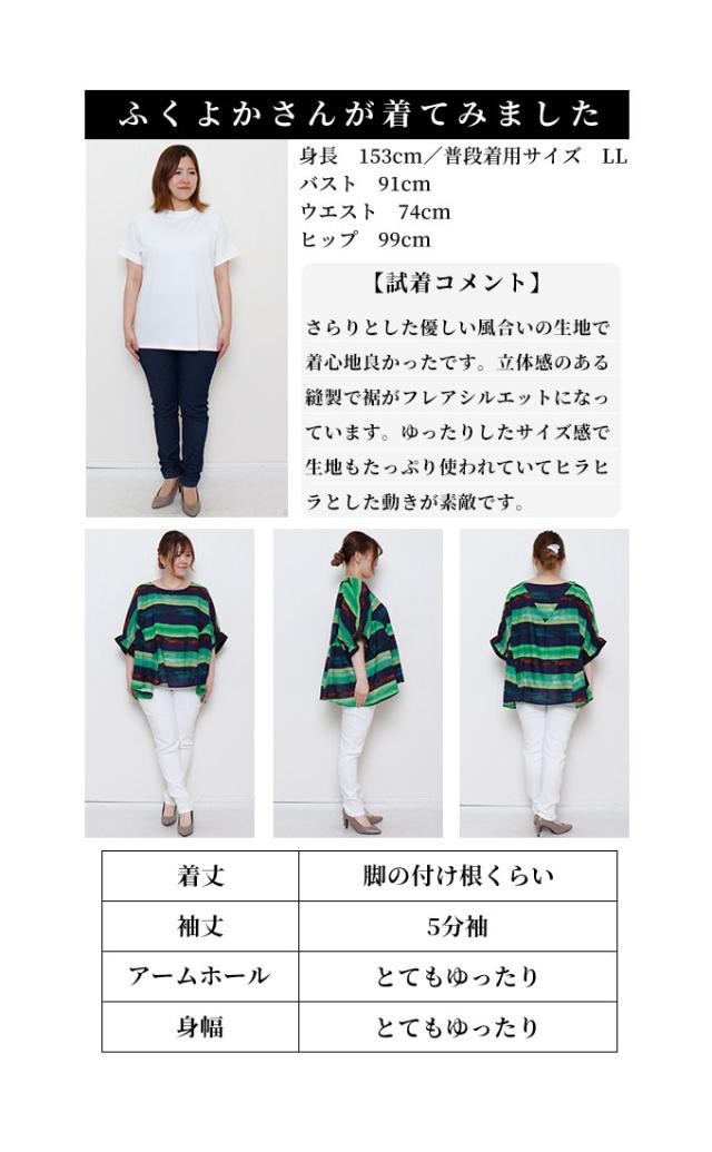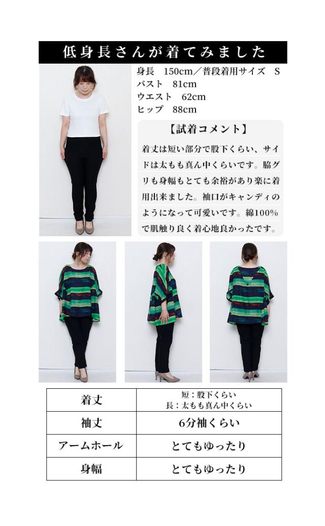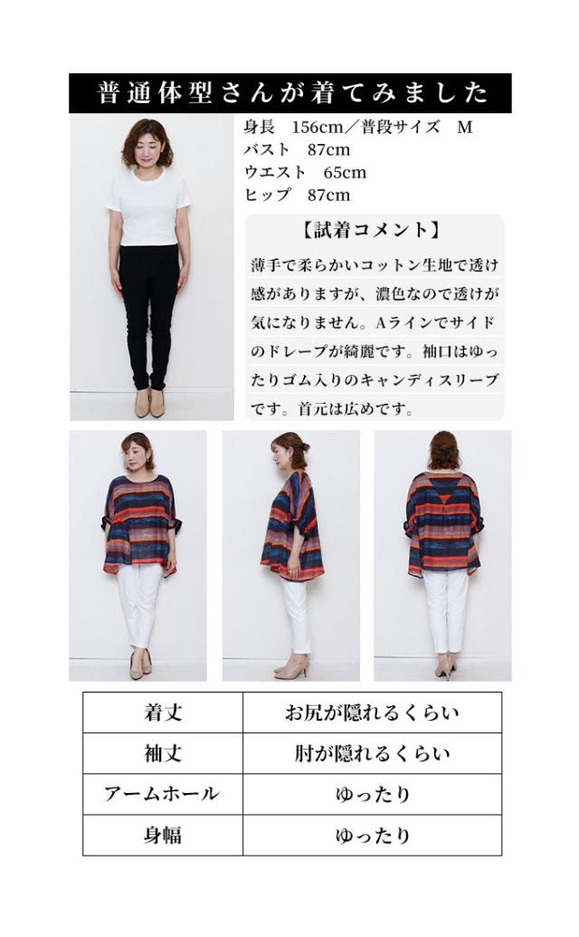 着丈はヒップが隠れるくらい、袖丈は肘が隠れるくらいです。薄手で柔らかいコットン生地で透け感がありますが、濃色のプリントなので透けが気にならず一枚で着用できます。身頃・袖ともにゆったりしていて、Aラインなのでサイドに出るドレープがキレイです。袖口はゆったりめのゴムの入ったキャンディスリーブです。首元は鎖骨が半分出るくらいの広めのラウンドネックです。