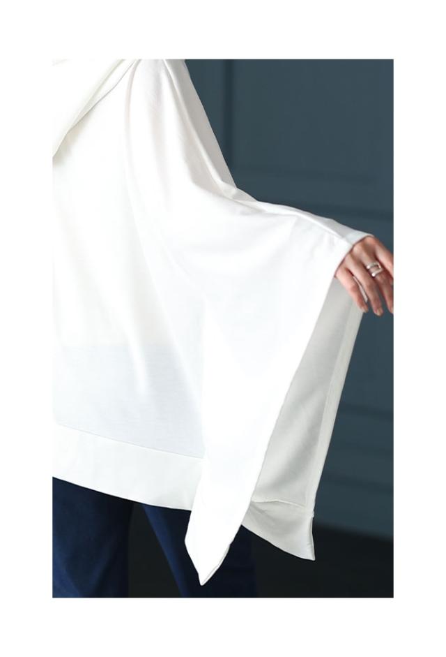 着丈はヒップが隠れるくらい、袖丈はちょうどでした。ポンチョの脇を縫い合わせたような、モモンガのようなボリューミィな袖のフーディです。伸縮性のあるカットソー生地で、ゆったりしたサイズ感なので楽な着心地でした。フードの紐も長めでアクセントになっています。インにハイネックなど、重ね着も楽しめるので長いシーズン着られます。