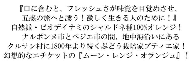 『口に含むと、フレッシュさが味覚を目覚めさせ、 五感の旅へと誘う!激しく生きる人のために!』 自然派・ビオデイナミのシャルドネ種100%オレンジ!ナルボンヌ市とベジエ市の間、地中海沿いにあるクルサン村に1800年より続くぶどう栽培家ブティエ家! 幻想的なエチケットの『ムーン・レンジ・オランジュ』!