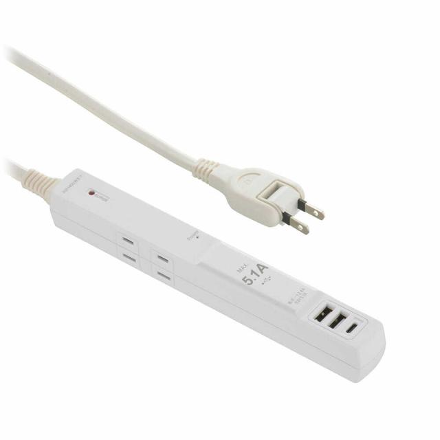 延長コード、電源タップ、発煙ガード、雷ガード、4個口、1.5m、独自技術で異常過熱を検知、通電火災からしっかり守る、AC機器最大4つまで接続、USBタイプA2ポート2個、USBタイプCポート1個、USB充電ポート、雷サージ軽減素子内蔵、落雷時のダメージを軽減、トラッキング火災防止プラグ、丈夫な二重被ふくコード、通電表示LEDランプ付き
