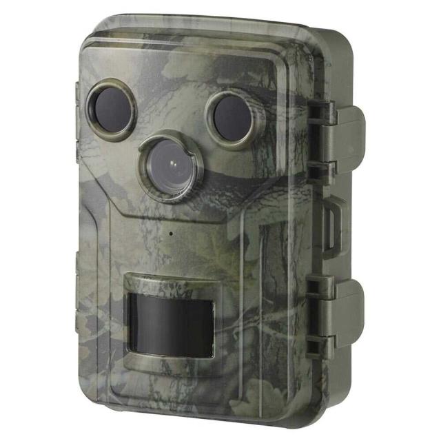 電池式、トレイルカメラ、防犯カメラ、人感センサー機能付き、人や動物を検知すると自動で録画を開始、防犯対策、害獣対策、2.0インチカラーモニター内蔵、その場ですぐに画像を確認、300万画素の高画質、赤外線LED搭載、夜間録画、保護等級IP66、防水防じん規格、屋外使用が可能、人感センサー検知距離は15m、静止画撮影、動画撮影モード、動画、音声、録音、乾電池式、配線不要
