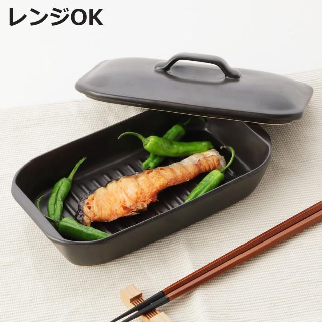 グリルプレート 19×11cm 長角 陶器 フタ付き 電子レンジ調理器具 ( グリルパン レンジパン 電子レンジ 調理器 魚焼き器 角型 グリルトレー 陶器製 オーブン 魚焼きグリル 対応 オーブン調理 蓋付き 耐熱皿 一人用 )