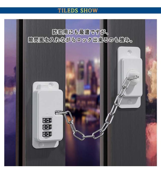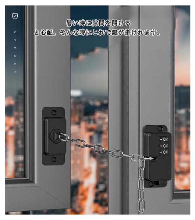 | 窓・引き戸用 ダイヤルワイヤーロック。窓や引き戸の補助用鍵、ロック。 防犯用にも最適ですが、隙間風を入れながらロック出来るのも強み。 暑い時に隙間を開けると心配。そんな時にこれで鍵が掛けれます。 お子様の安全にもペットの脱走防止にも。 ドア、窓、キャビネット、冷蔵庫、飲料水機すべて使用可能です。 パスワードの変更: 注意:パスワードを忘れないようにしてください。 1.ロックを初期パスワード:000に調整し、スイッチを押すとロックが開きます。 2.ツールでレギュレータを押し付けます。 3つ押ししながら指のゆらぎ数字で希望する暗証番号に調整します。 4.セット完了後、ワイヤロープでロックを掛けるパスワードを乱すと施錠状態となります 。 | |
