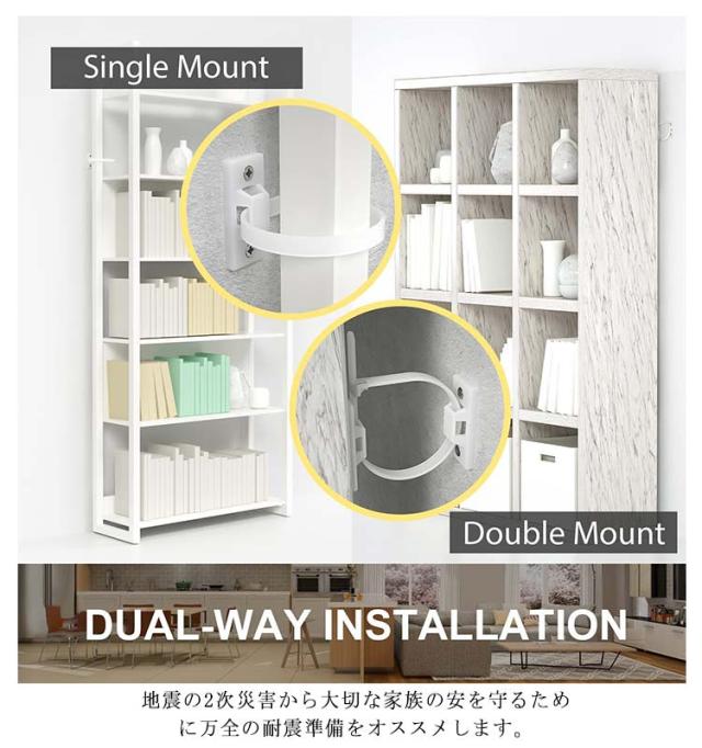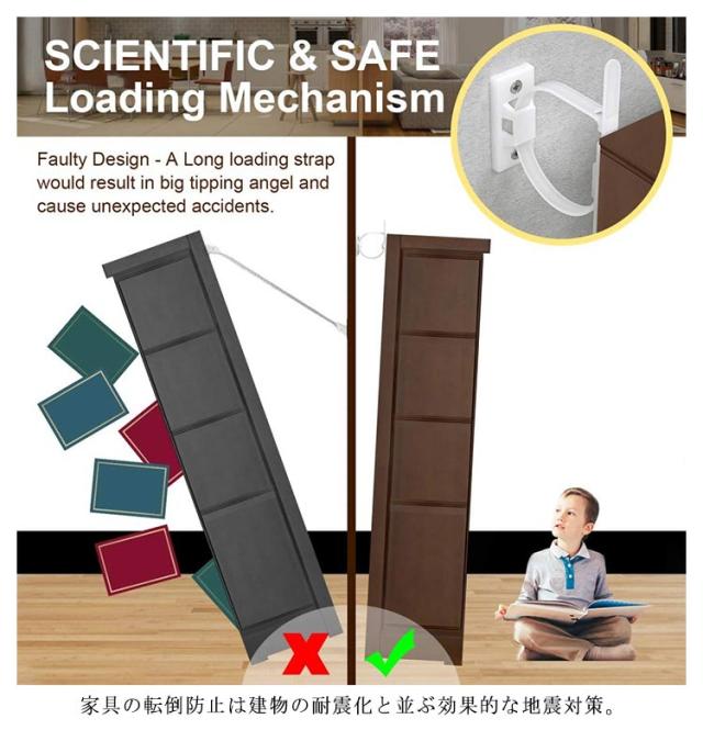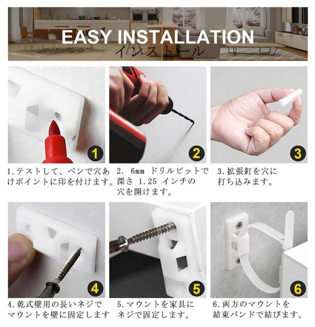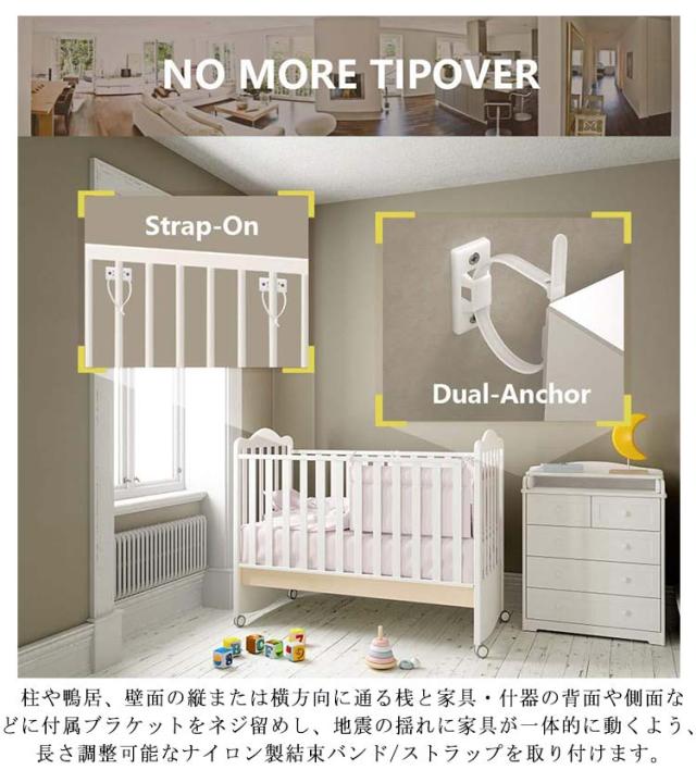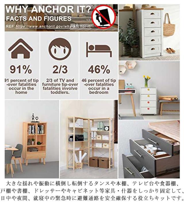 | 耐震・転倒防止用壁アンカーキットです。 設置簡単。 家具の転倒防止は建物の耐震化と並ぶ効果的な地震対策。 地震の揺れや子供のぶら下がりによる家具の転倒や移動を防ぎ、不安定な家具を固定して安心・安全なくらしを守る。 柱や鴨居、壁面の縦または横方向に通る桟と家具・什器の背面や側面などに付属ブラケットをネジ留めし、地震の揺れに家具が一体的に動くよう、長さ調整可能なナイロン製結束バンド/ストラップを取り付けます。 大きな揺れや振動に横倒し転倒するタンスや本棚、テレビ台や食器棚、戸棚や書棚、ドレッサーやキャビネット等家具・什器をしっかり固定して、日中や夜間、就寝中の緊急時に避難通路を安全確保する役立ちキットです。 ※壁固定金具を使用する際は壁の材質や構造、強度にご注意ください。 地震の2次災害から大切な家族の安を守るために万全の耐震準備をオススメします。 | |