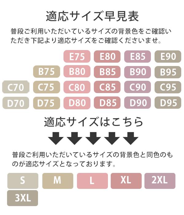 S:32/70(C70,D70対応) M:34/75(B75,C75,D75対応) L:36/80(75E,B80,C80,D80対応) XL:38/85(80E,B85,C85,D85対応) 2XL:40/90(85E,B90,C90,D90対応) 3XL:42/95(90E,B95,C95,D95対応) |