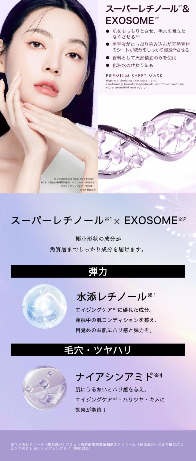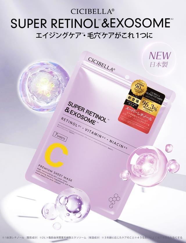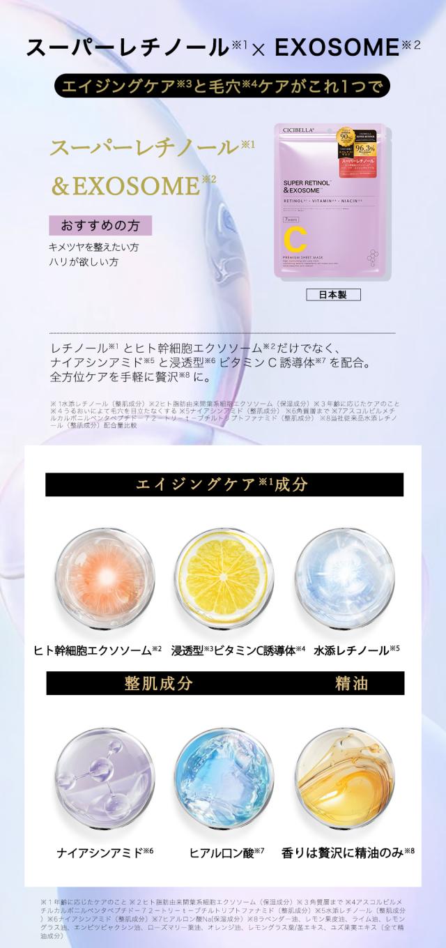 【シシベラスパビタマスクSUPERレチノール×EXOSOME】水、グリセリン、DPG、BG、水添レチノール、ヒト脂肪由来間葉系細胞エクソソーム、ヒト幹細胞順化培養液、アスコルビルメチルカルボニルペンタぺプチド-72-トリ-t-ブチルトリプトファナミド、ヒアルロン酸Na、ヒアルロン酸ヒドロキシプロピルトリモニウム、加水分解コラーゲン、グリチルリチン酸2K、ローマカミツレ花エキス、トウキンセン力花エキス、ヤグルマギク花エキス、カミツレ花エキス、セイヨウオトギリソウ花/葉/茎エキス、フユボダイジュ花エキス、キサンタンガム、クエン酸、クエン酸Na、PEG-60水添ヒマシ油、EDTA-2Na、ラベンダー油、レモングラス油、セイヨウハッカ油、ローズマリー葉油、二オイテンジクアオイ油、メチルパラベン、フェノキシエタノール、水添レシチン、1,2-ヘキサンジオール、ポリソルベート80、カプリリルグリコール、酢酸トコフェロール、トリ(カプリル酸/カプリン酸)グリセリル