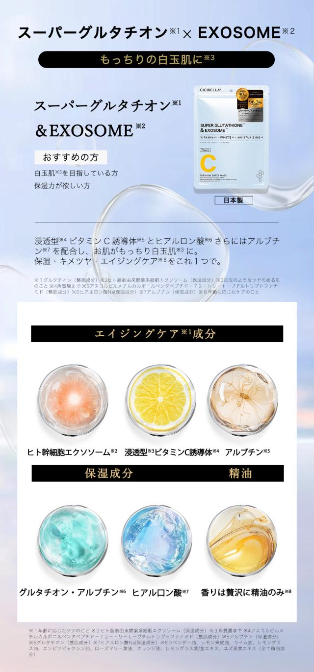 【シシベラスパビタマスクSUPERグルタチオン×EXOSOME】水、BG、グリセリン、グルタチオン、ヒト脂肪由来間葉系細胞エクソソーム、ヒト幹細胞順化培養液、アスコルビルメチルカルボニルペンタぺプチド-72-トリ-t-ブチルトリプトファナミド、パルミチン酸アスコルビル、アルブチン、グリチルリチン酸2K、ヒアルロン酸Na、加水分解コラーゲン、ラベンダー油、レモングラス油、セイヨウハッカ油、ローズマリー葉油、ニオイテンジクアオイ油、PEG-6O水添ヒマシ油、キサンタンガム、クエン酸、クエン酸Na、メチルパラベン、フェノキシエタノール、リノール酸、リノレン酸、レシチン、水添レシチン、1,2-ヘキサンジオール、ポリソルベート8O、カプリリルグリコール、酢酸トコフェロール、トリ(カプリル酸/カプリン酸)グリセリル