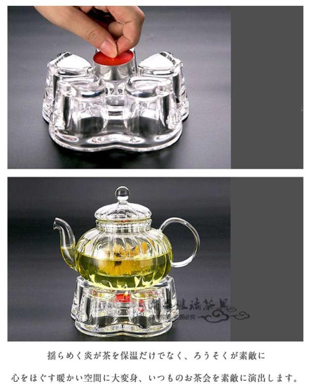 | 透明度の高いティーポットとガラス保温ウォーマンセット 透明度の高いガラスで茶葉の動きや、色の出具合がクリアに見えます。 耐熱ガラス製なので熱湯もOK! ウォーマー付きはこのセットの特徴です。 揺らめく炎が茶を保温だけでなく、ろうそくが素敵に心をほぐす暖かい空間に大変身、いつものお茶会を素敵に演出します。 美味しい紅茶を淹れられます。 キャンドルによる炎でティーポットを温め、お茶を長時間温かく飲むことが出来ます。 ※電気陶炉、ガスコンロともご使用可能ですが卓上IH調理器は使用は不可です。 | |