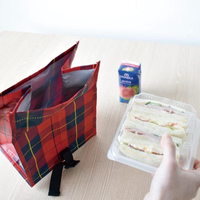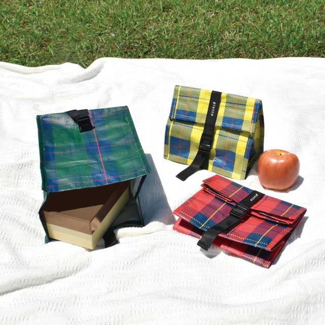 丈夫で紙袋のように軽く持ち運びしやすいコンパクトサイズのランチバッグです。耐久性が高いレジャーシートと同じ素材を使用しています。タータンチェック柄が可愛くお出かけが楽しくなるアイテムです。