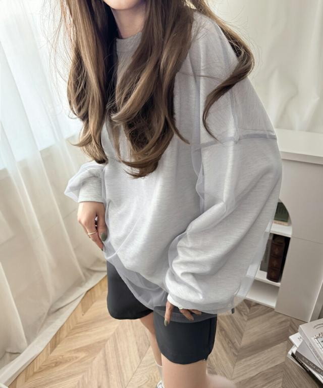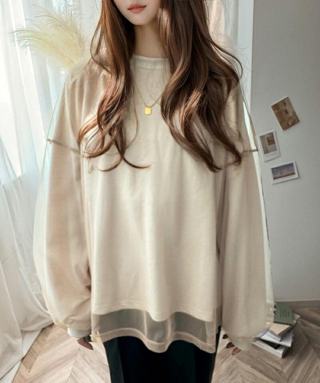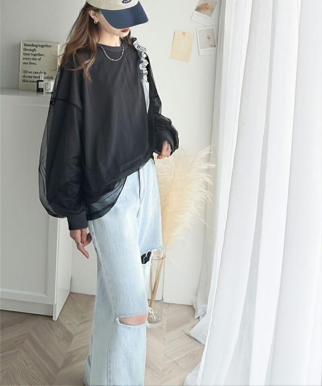 カジュアルなTシャツに繊細なチュールをドッキングした