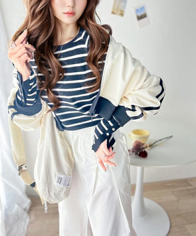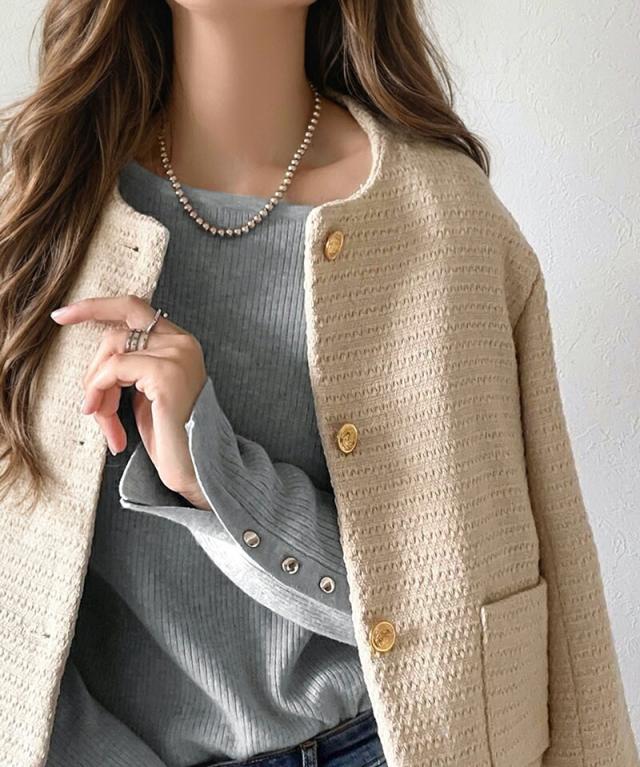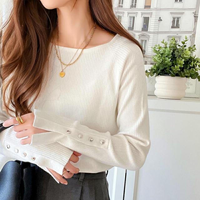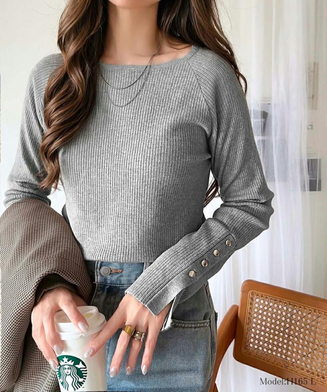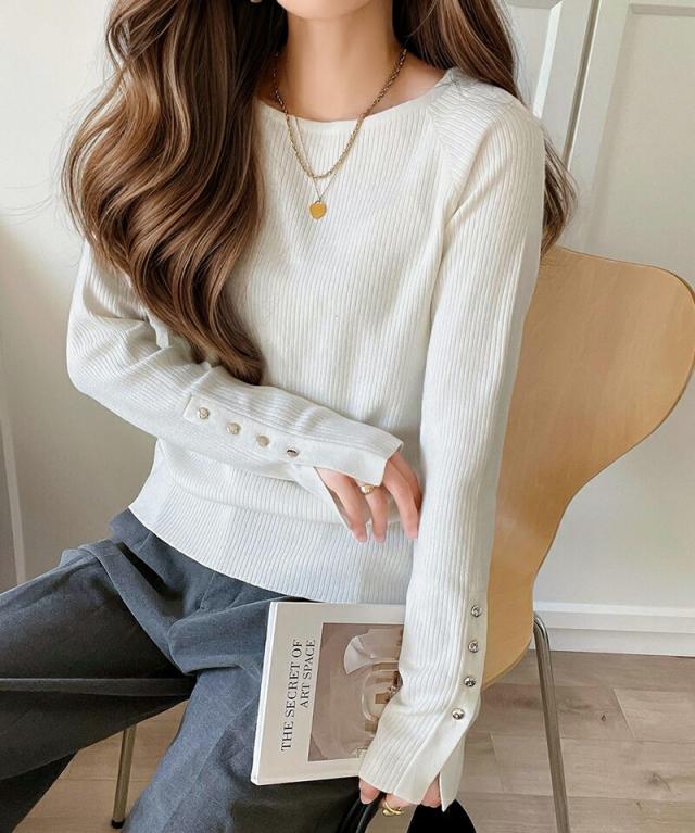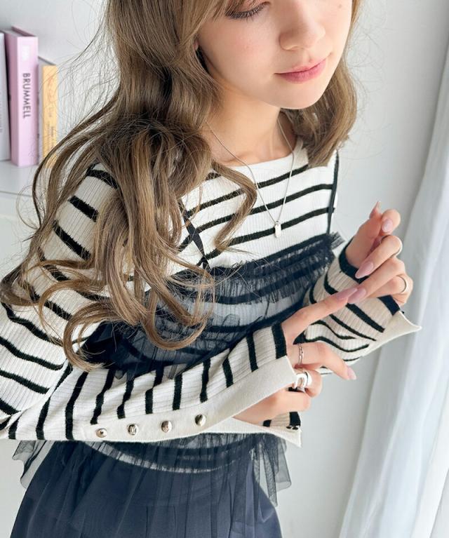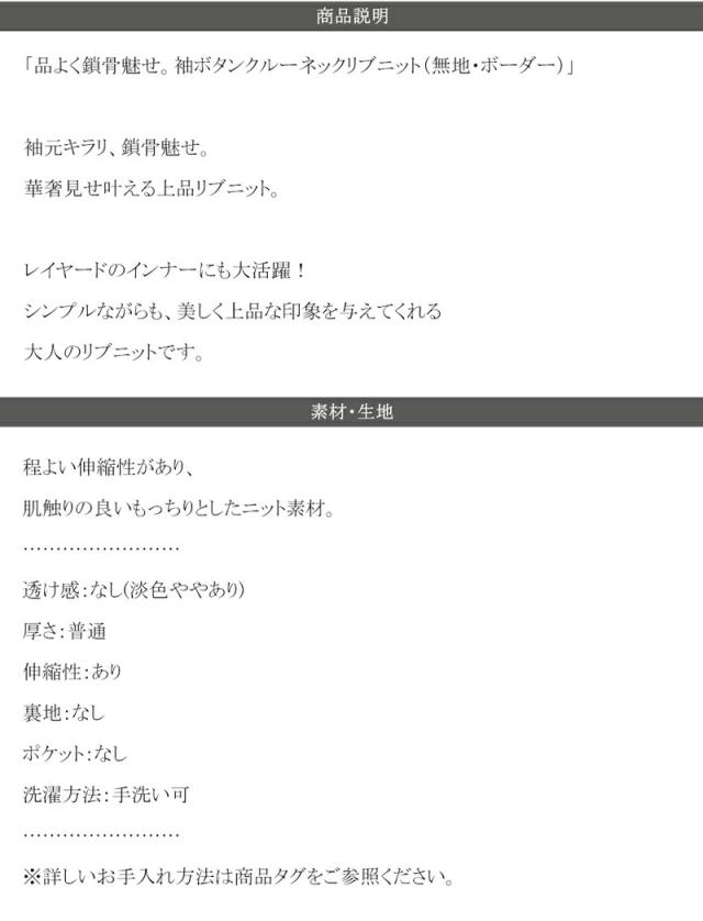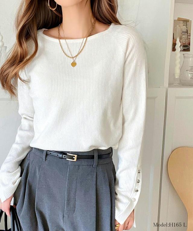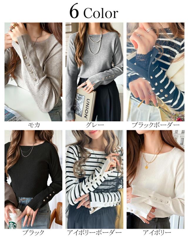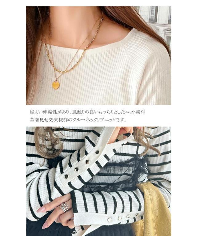★品よく鎖骨魅せ。袖ボタンクルーネックリブニット(無地・ボーダー)★
