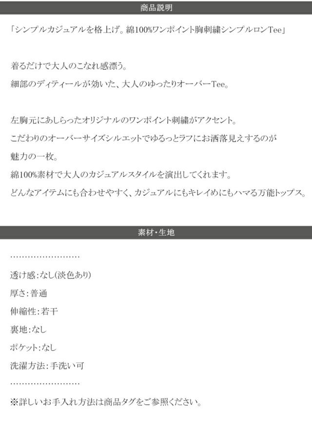 ★シンプルカジュアルを格上げ。綿100%ワンポイント胸刺繍シンプルロンTee★