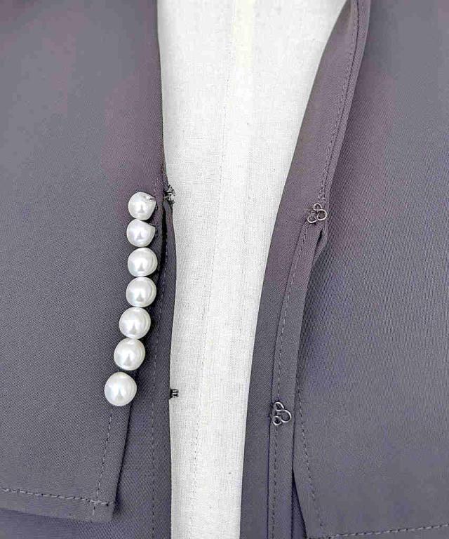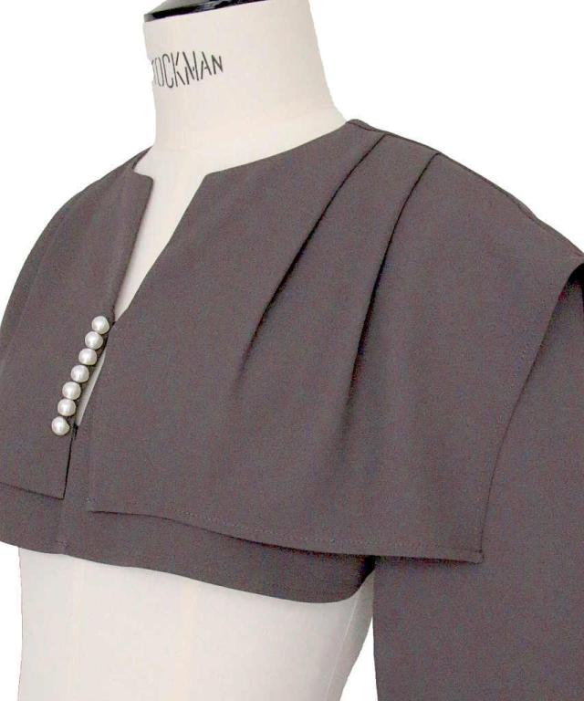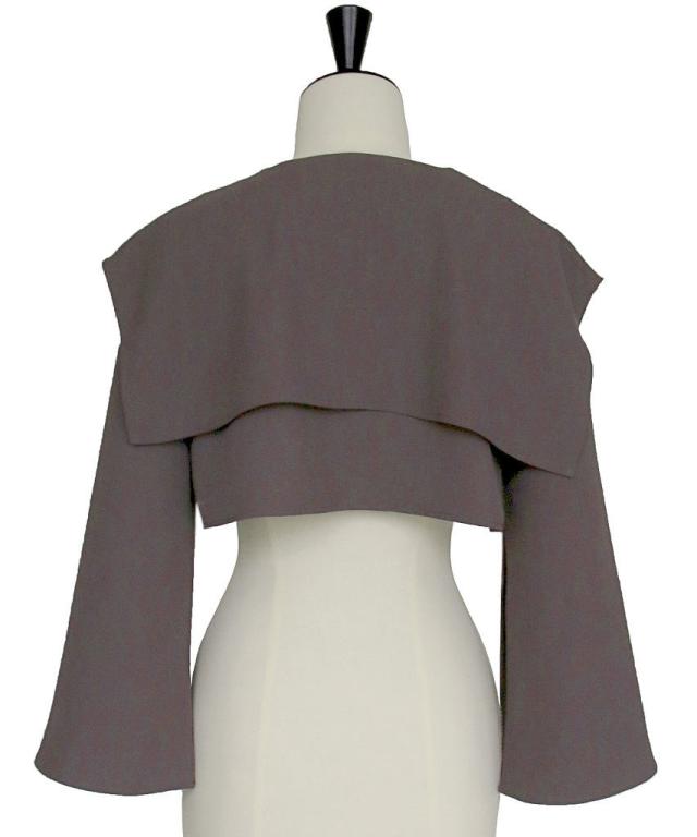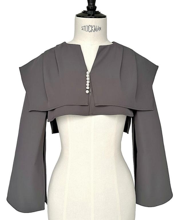 大きめの襟が小顔効果も叶えてくれるショートボレロ。パールの飾りがアクセントに。