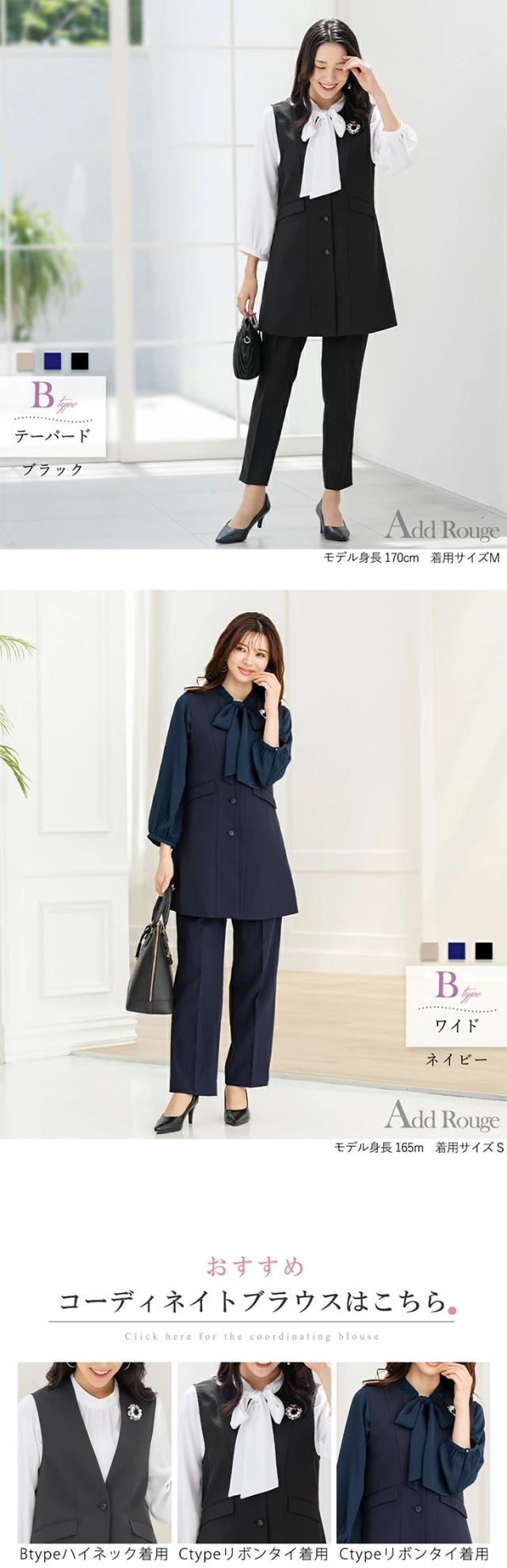 パンツはセンターにタックが入っており、ヒップとお腹周りをすっきり見せてくれるテーパードパンツタイプと、太もも周りをきれいにカバーするワイドパンツもお選びいただけます。